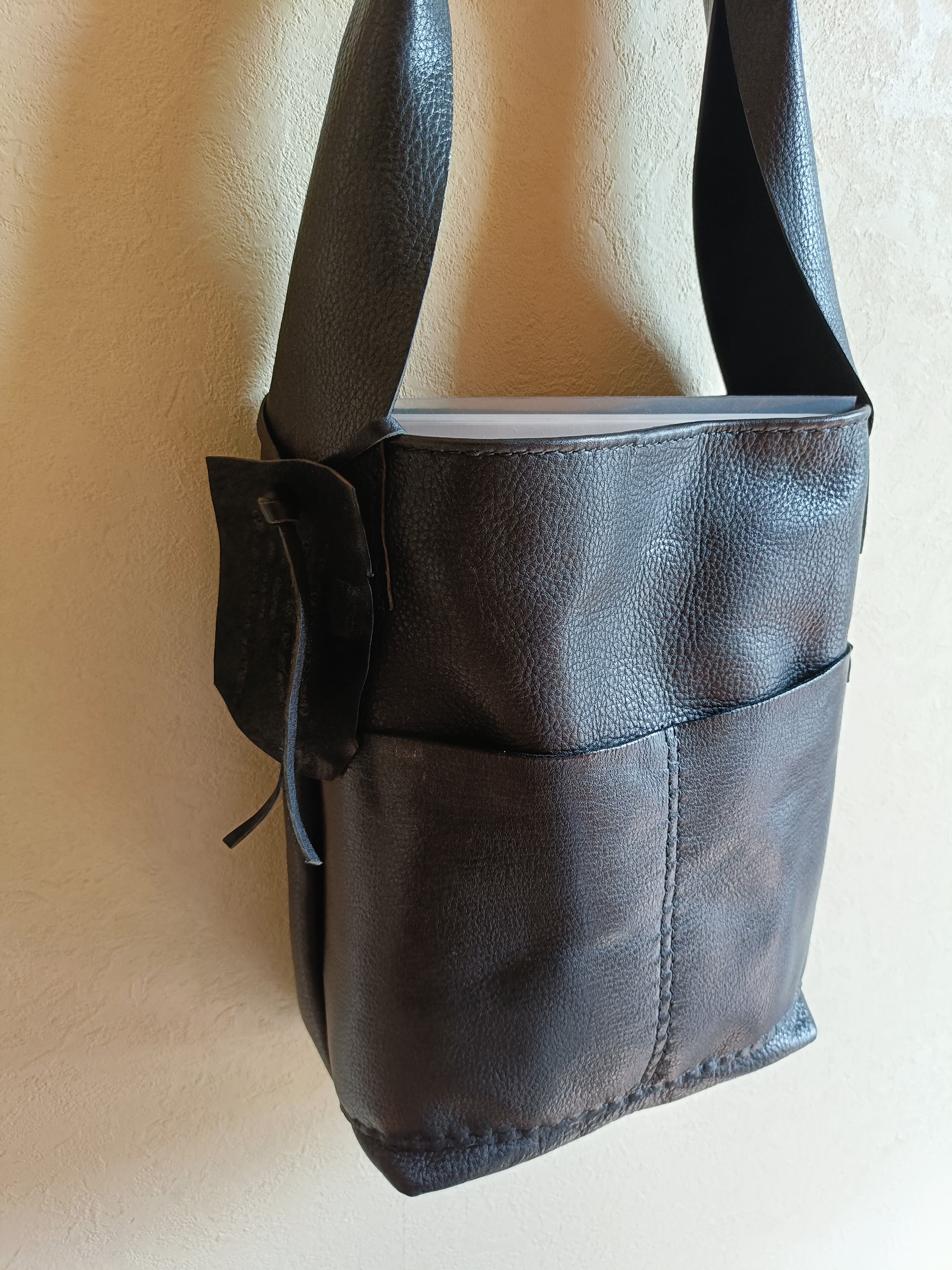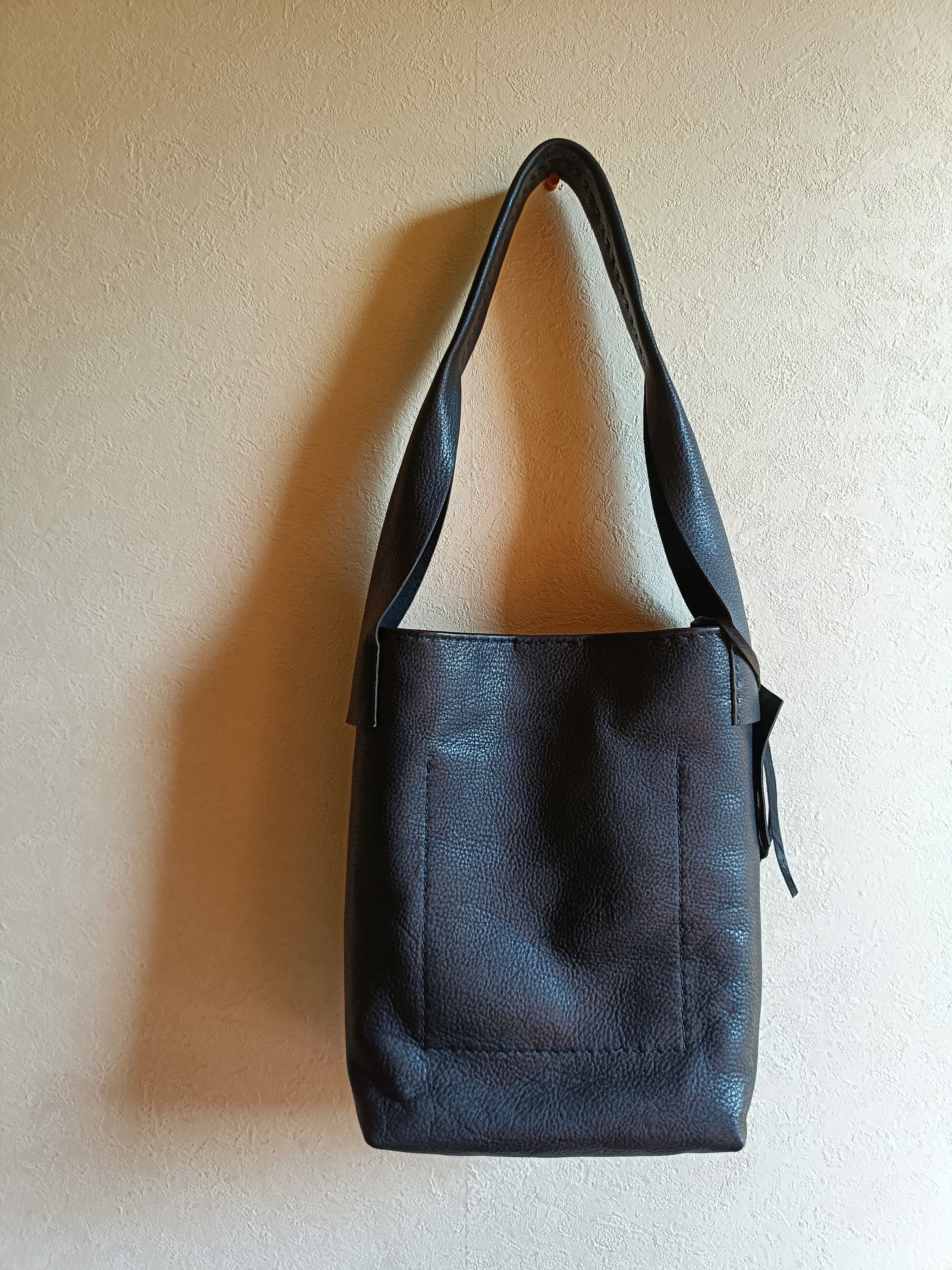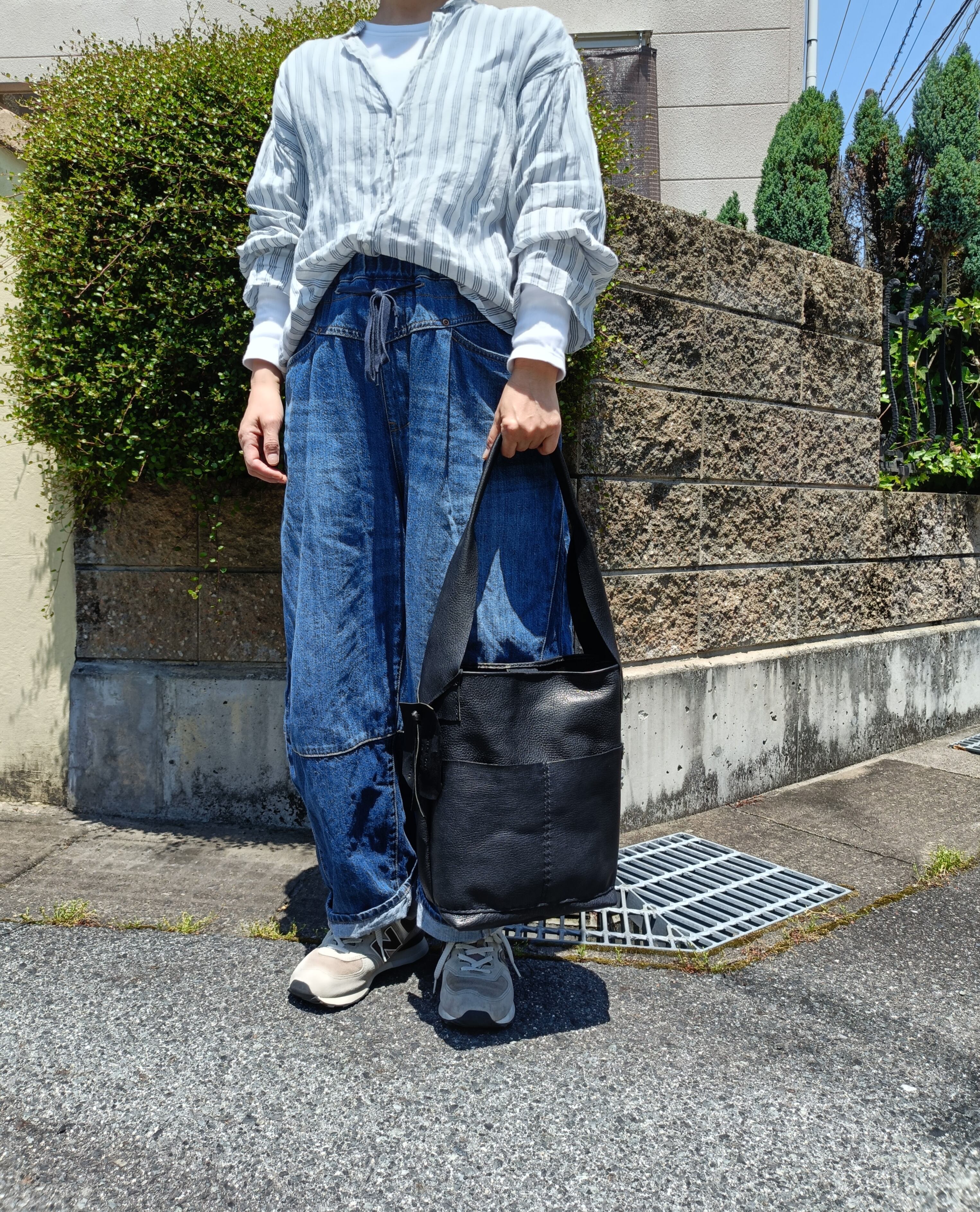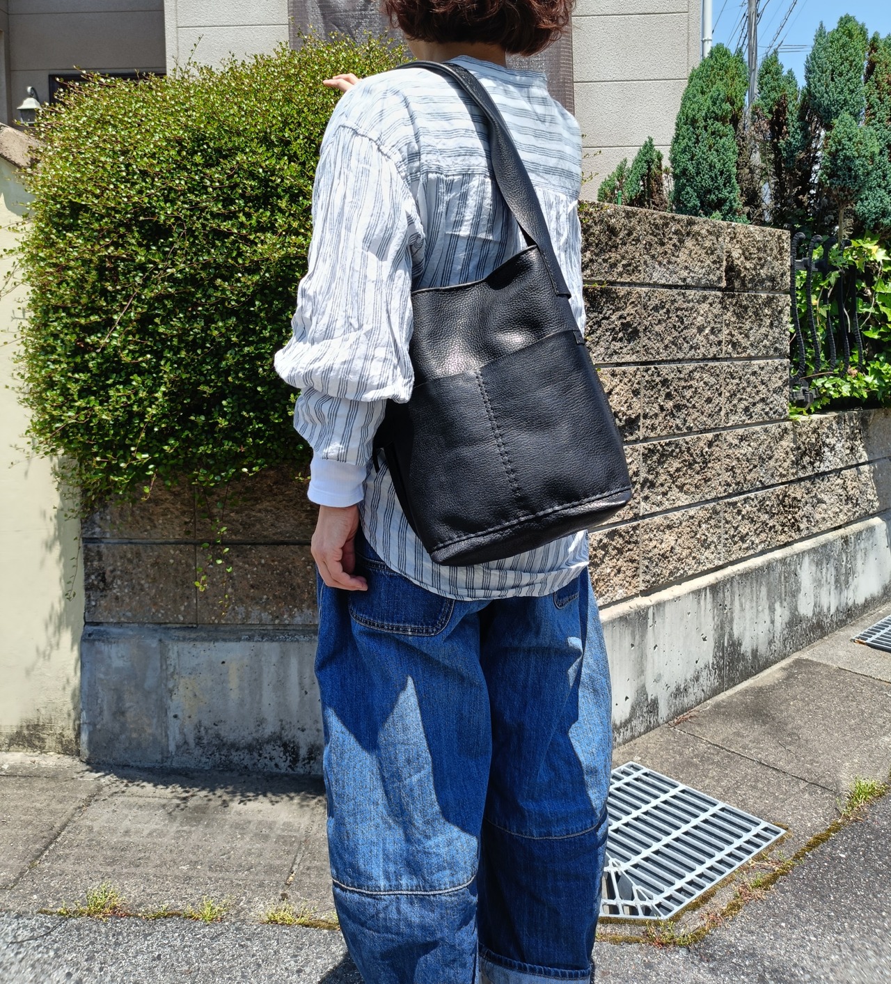 牛革。吟付きによる自然な光沢と染料仕上げによって透明感があり、シボが大きめであることでカジュアルさに加え、高級感がプラスされた素材です