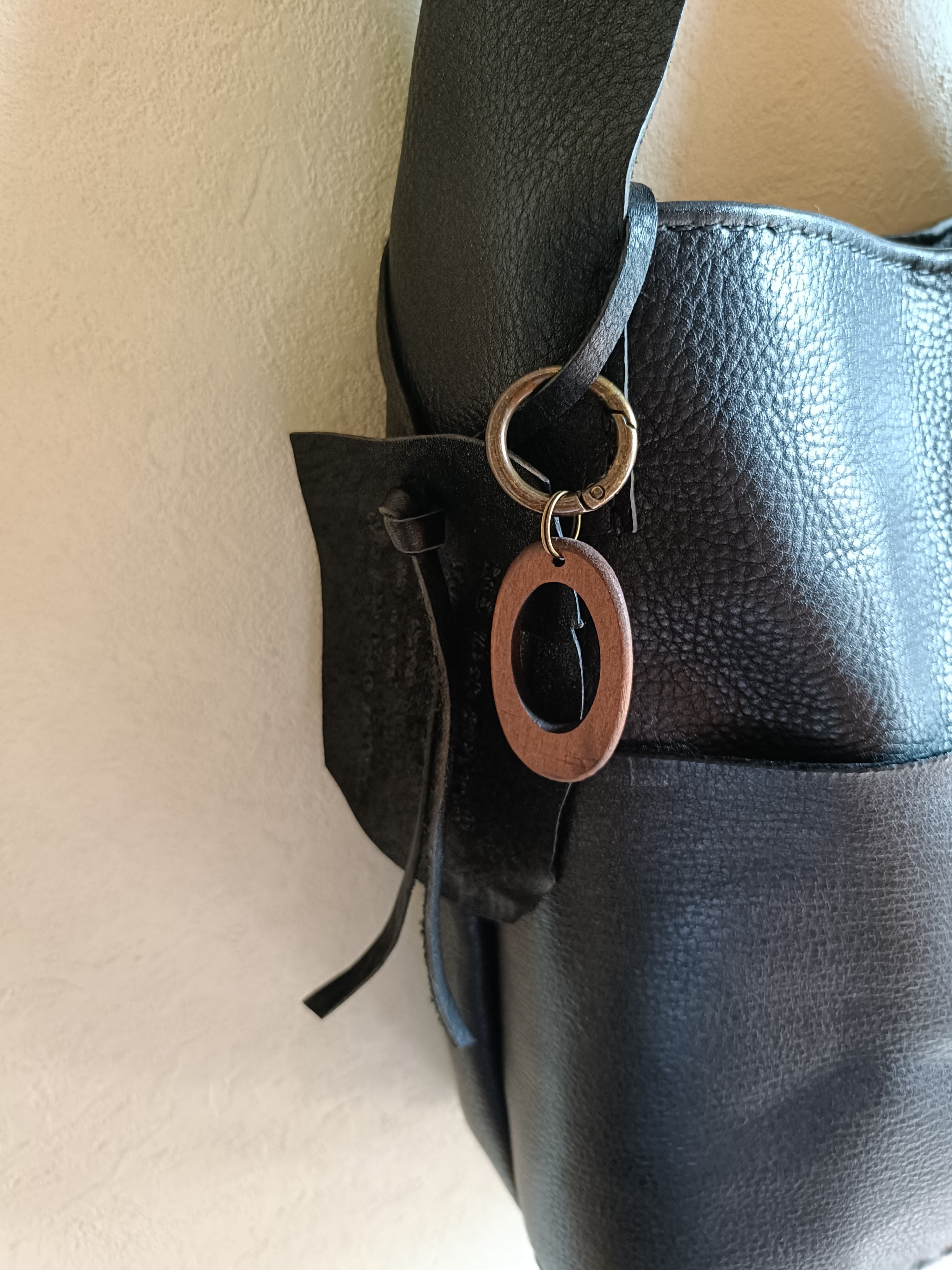 ◎メガネや鍵などを掛けられるカラビナと木のチャームをお付けしました