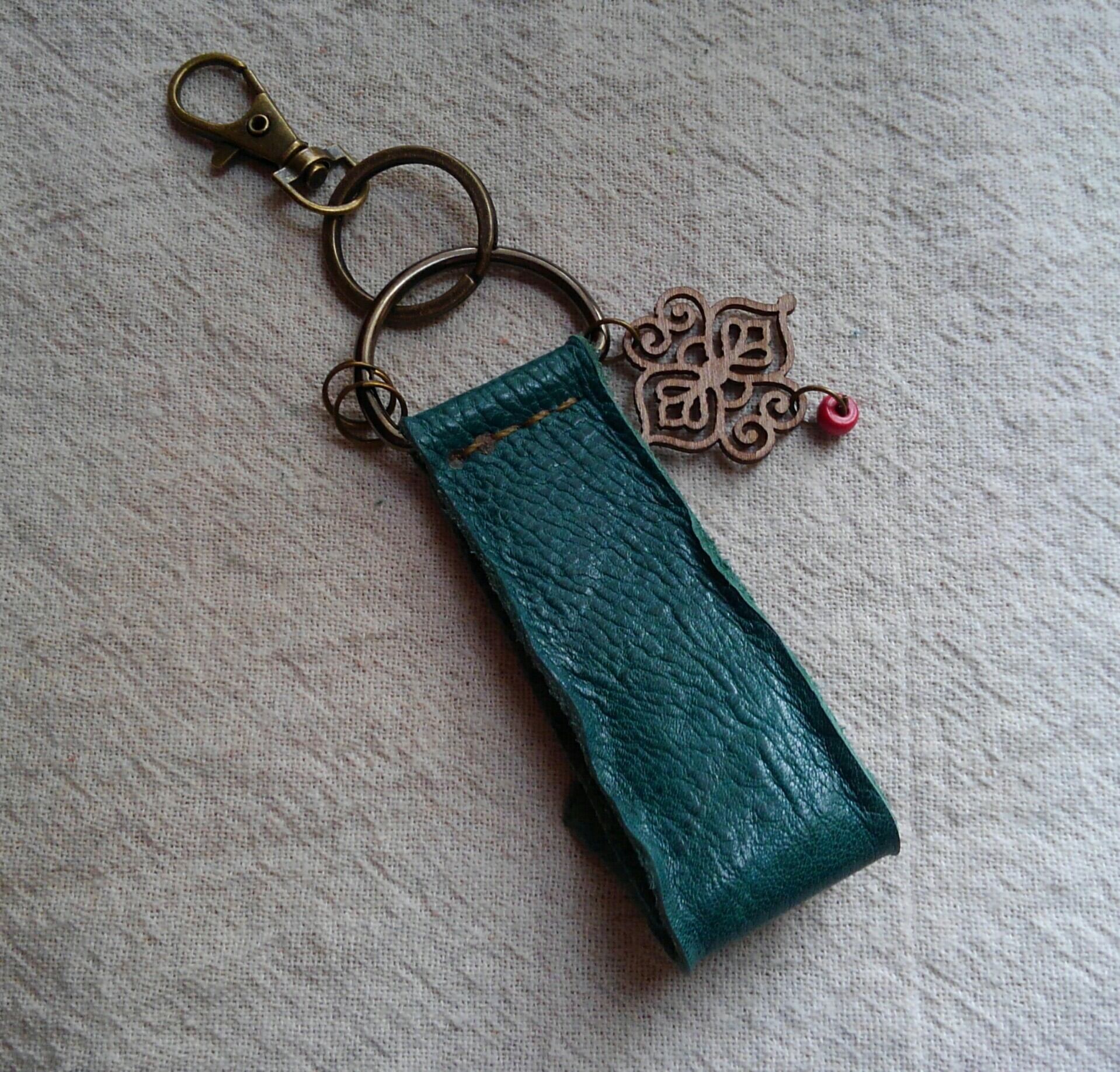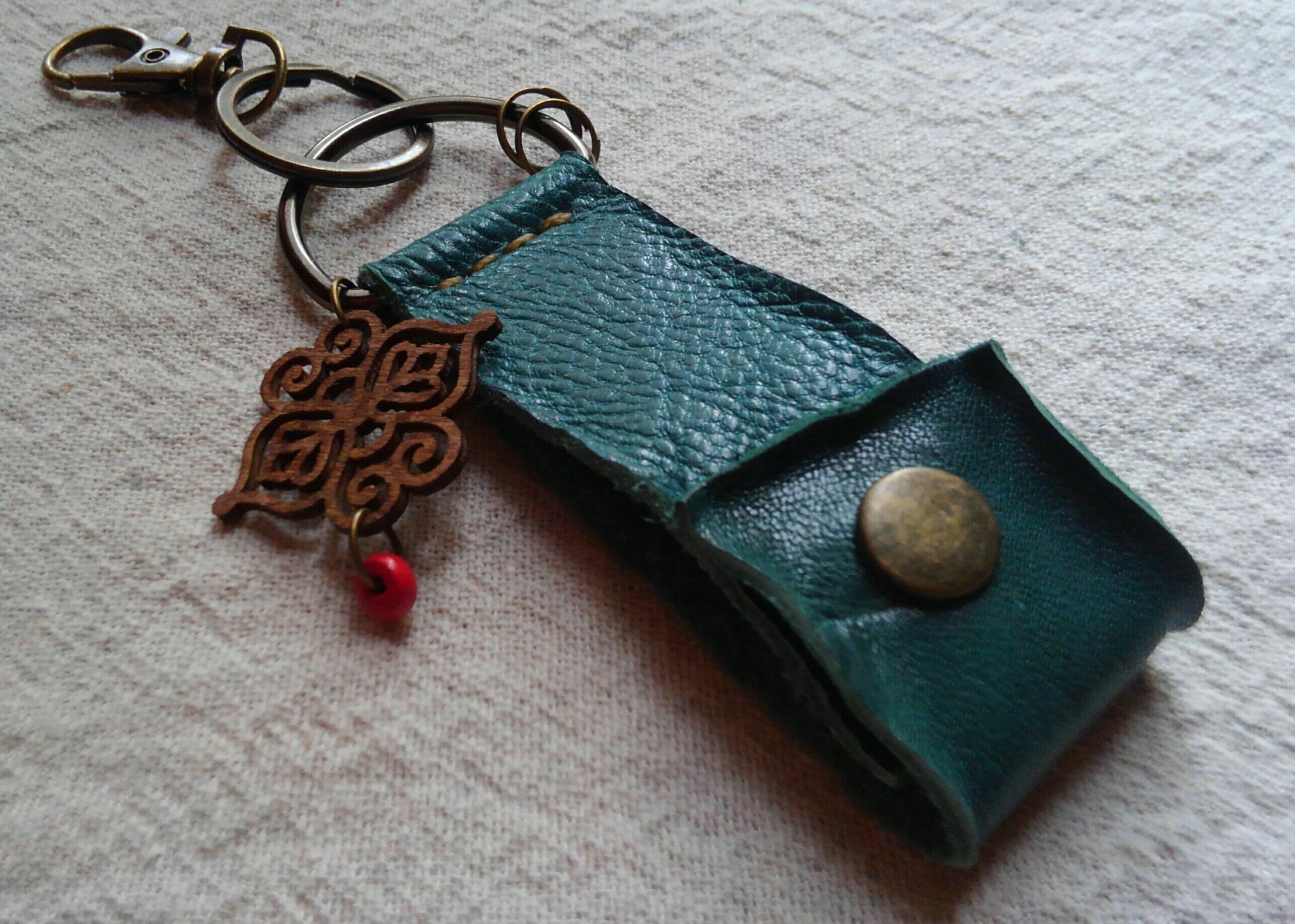 グリーン キーホルダー 木のモチーフと赤いウッドビーズ