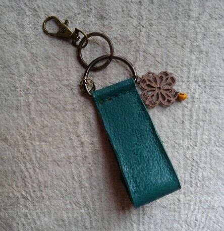 グリーンの牛革で、キーホルダーを作りました。