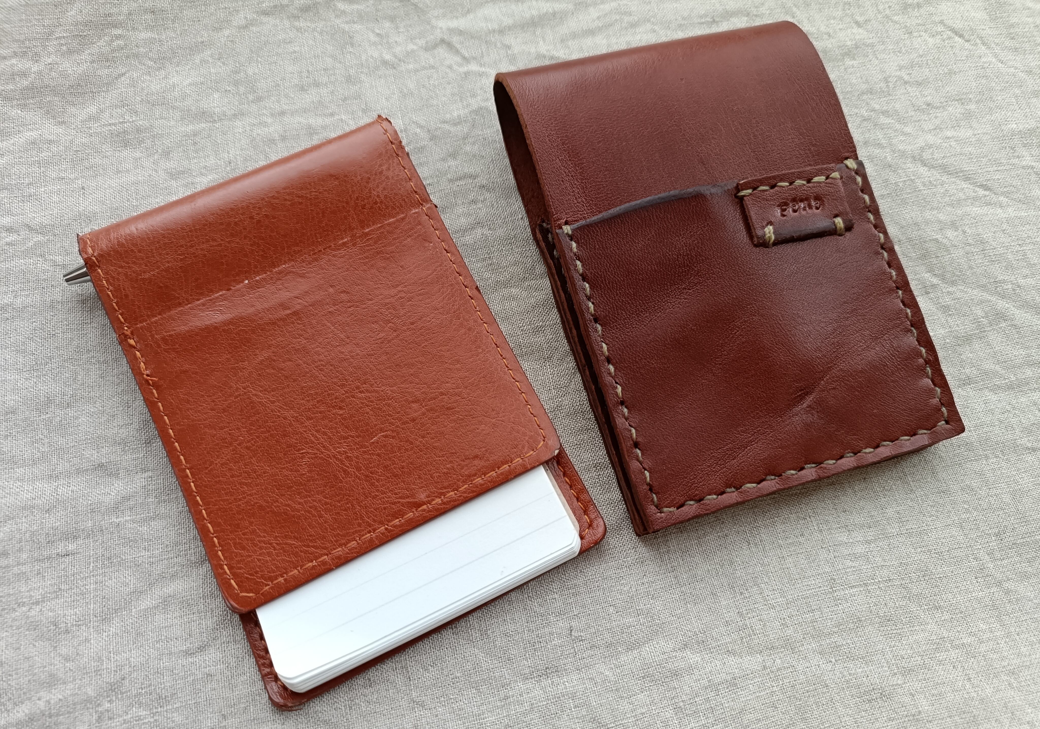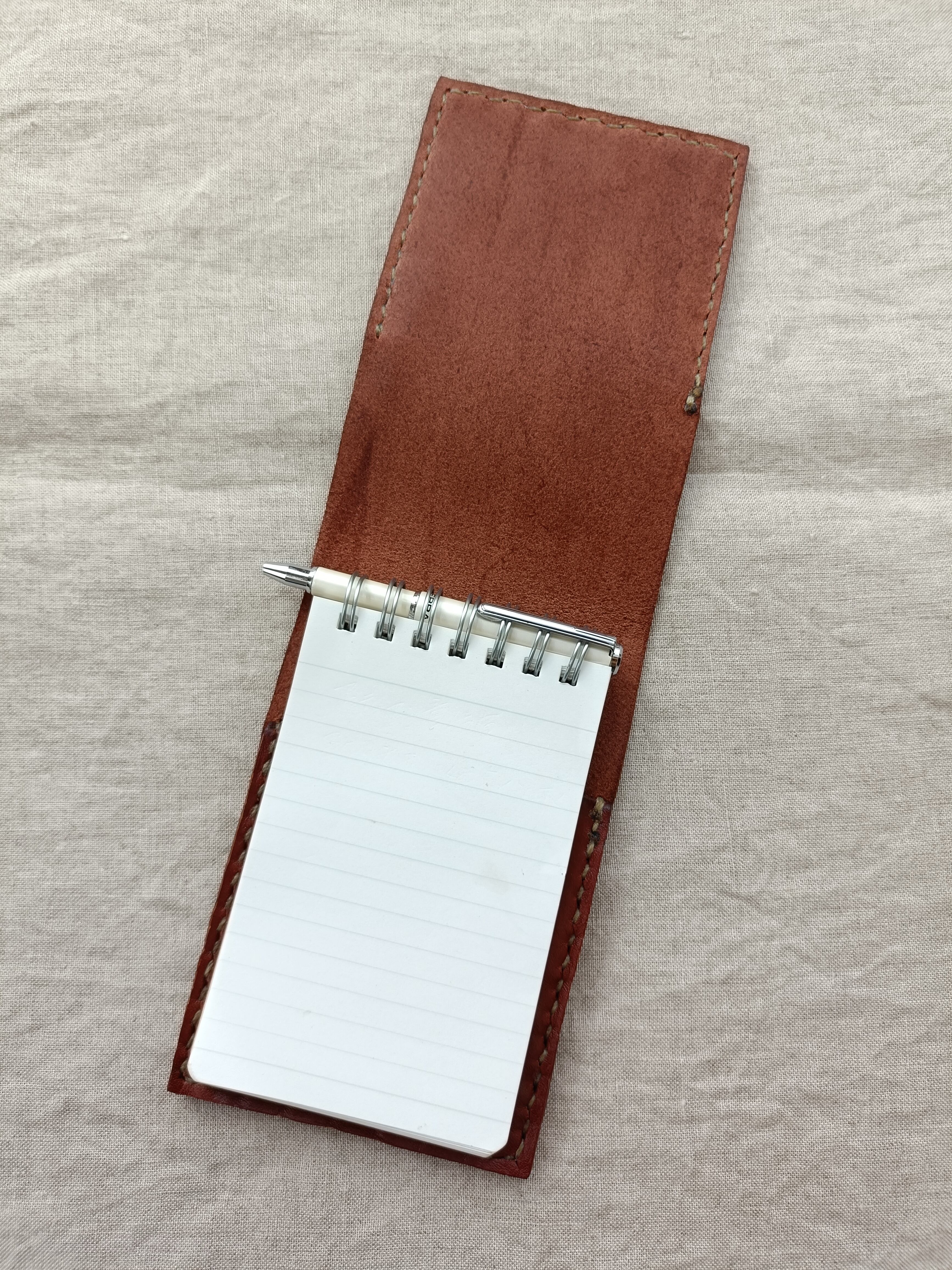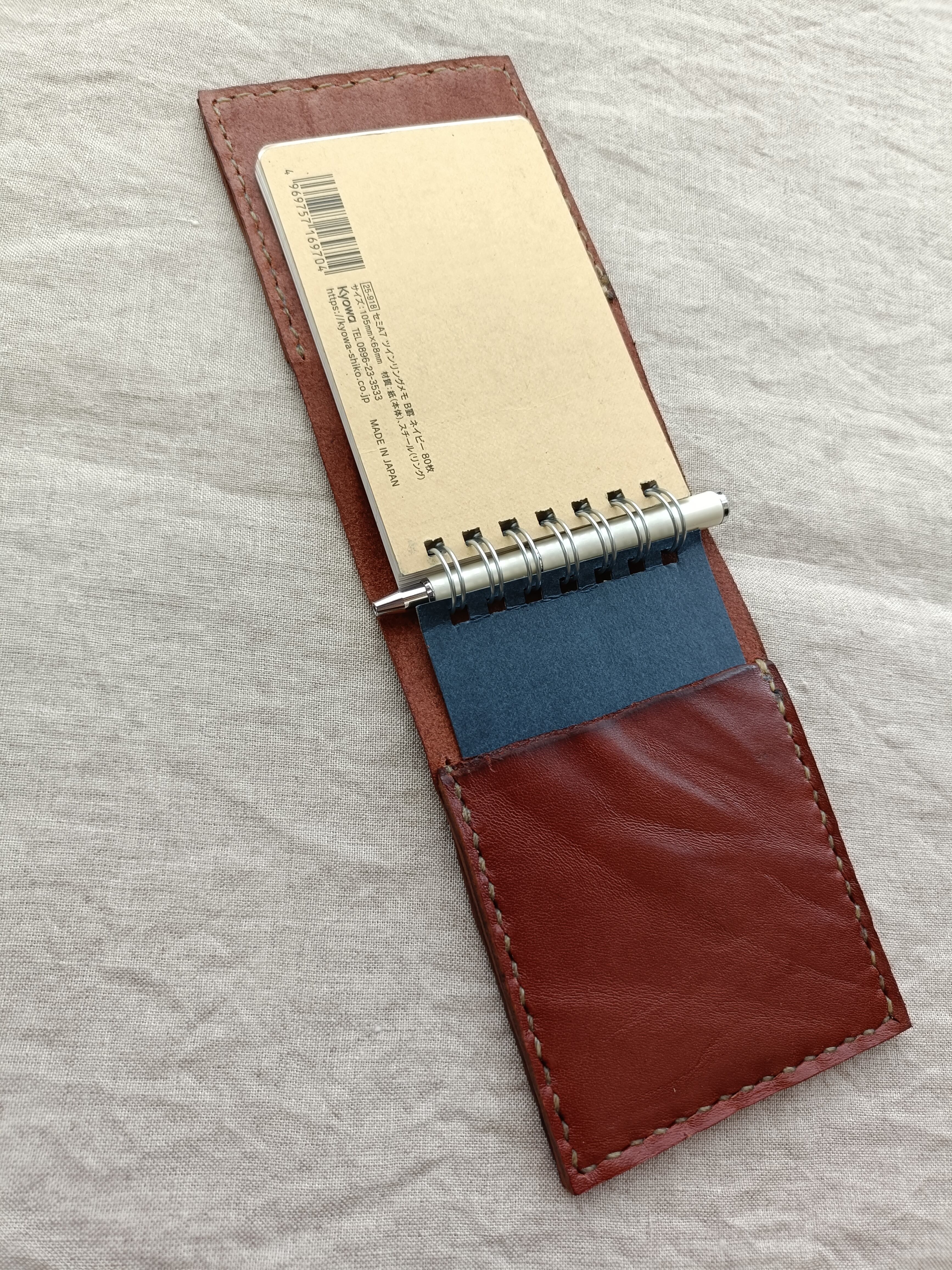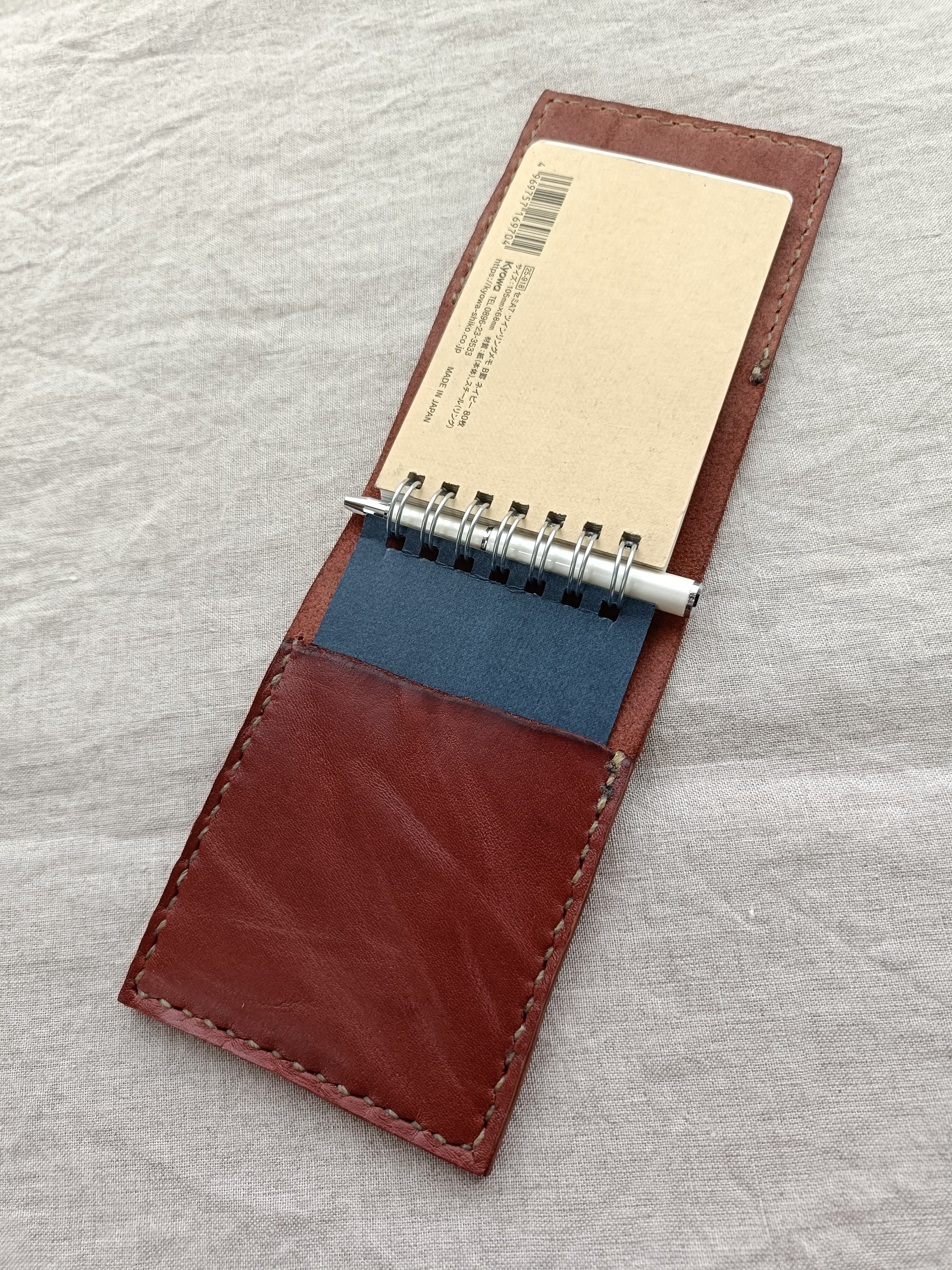 今までお使いになっていたメモ帳とメモ帳カバーをお預かりし、同デザインで、サイズが合うようにお作りさせていただきました