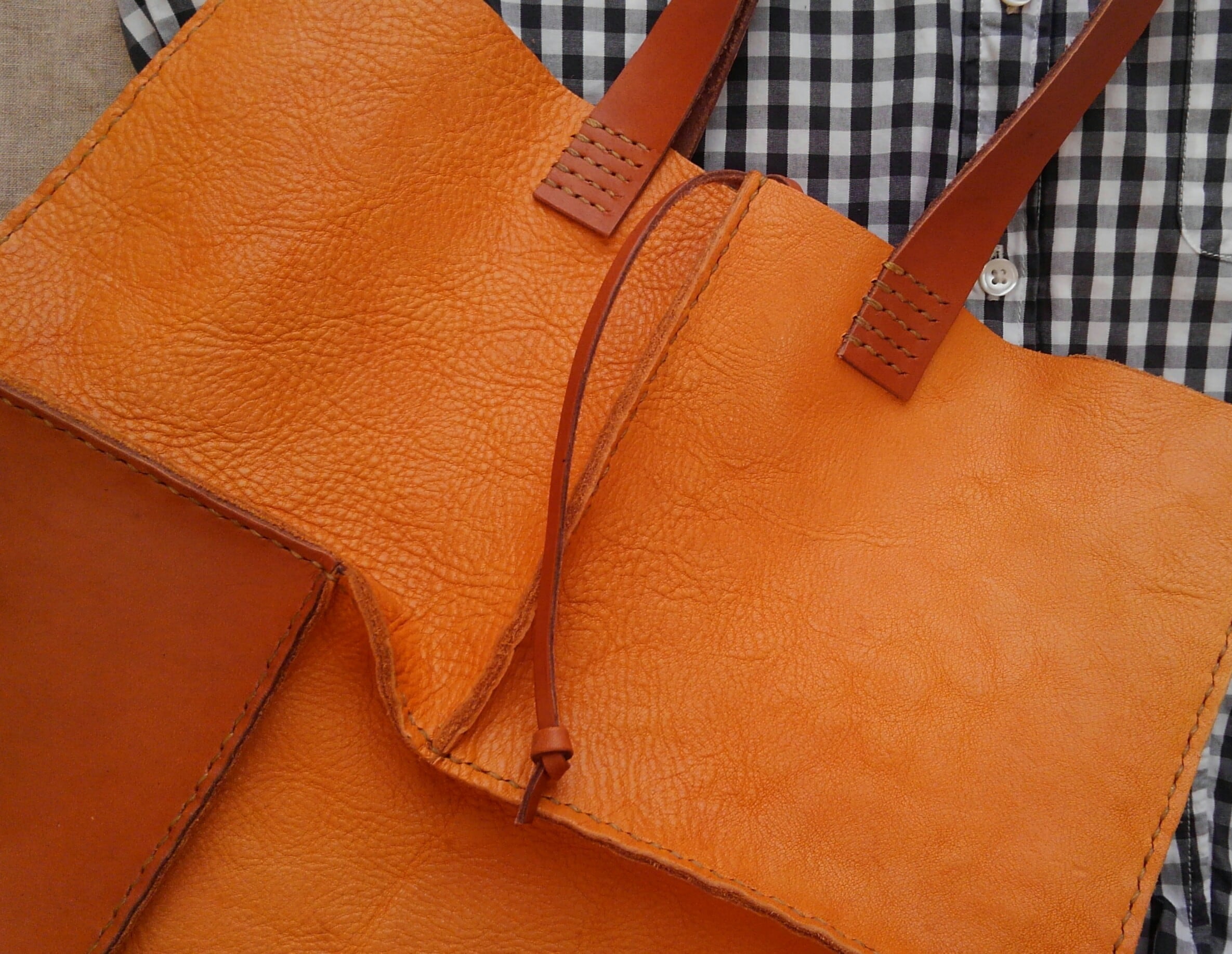 本体のキャメルの革は、何槽もの植物タンニン液のプール(ピット槽)に1ヶ月ほどの月日をかけ漬け込んで鞣された、ピットヌメで、硬質感はなく程よく腰があります。