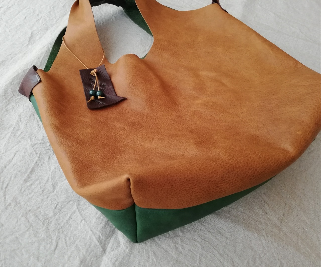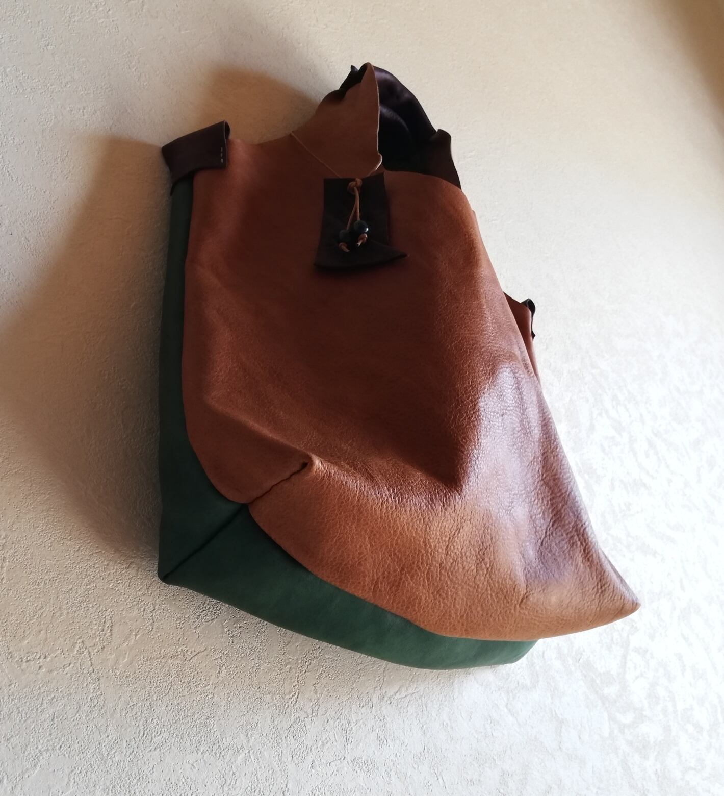 持ち手一体型 シンプルトート オイルシュリンクレザー ヌメベージュ✗グリーン✗ダークブラウン