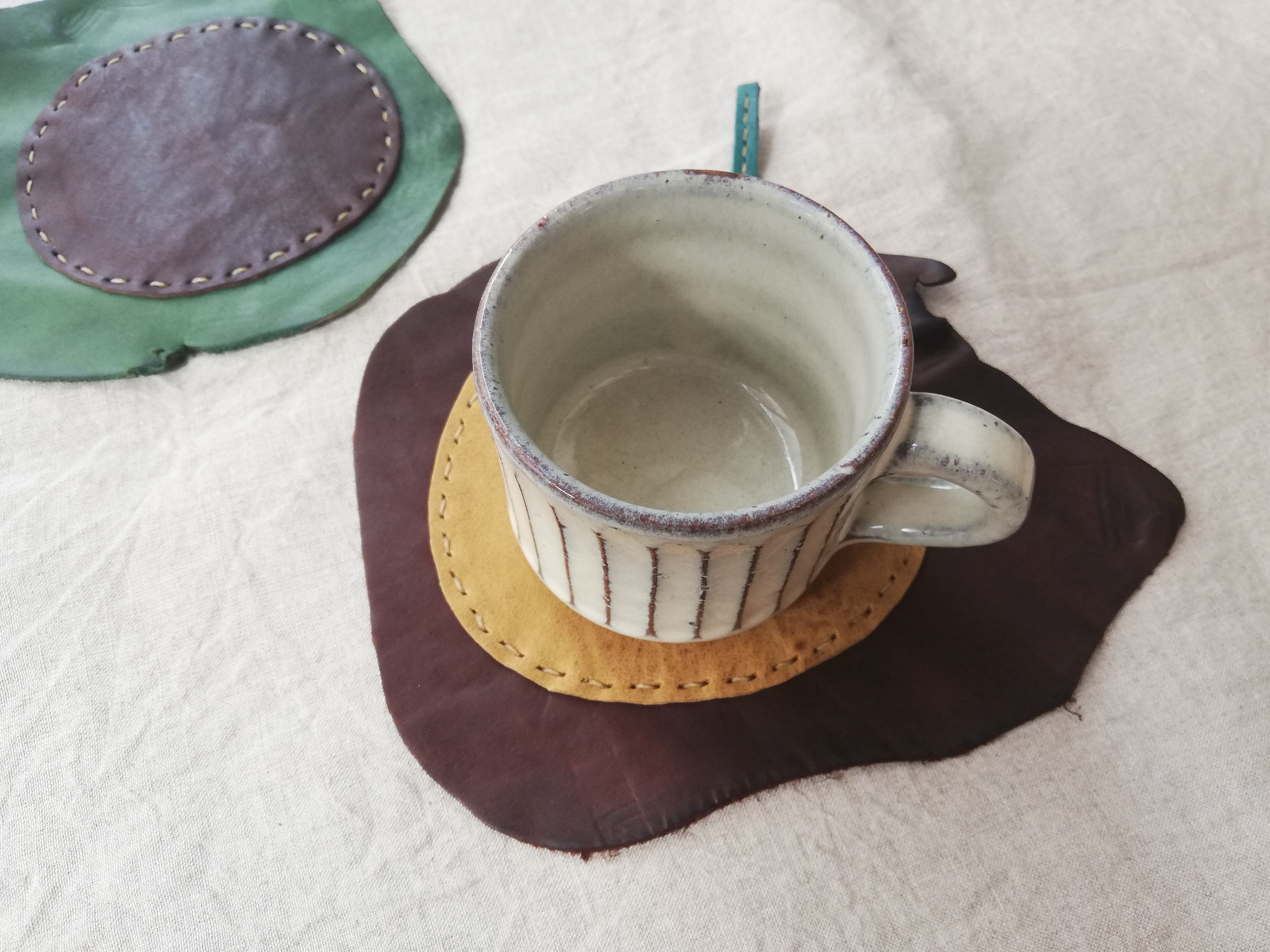 ペア de レザーコースター ビッグサイズ オイルシュリンクレザー グリーン&マスタードイエロー