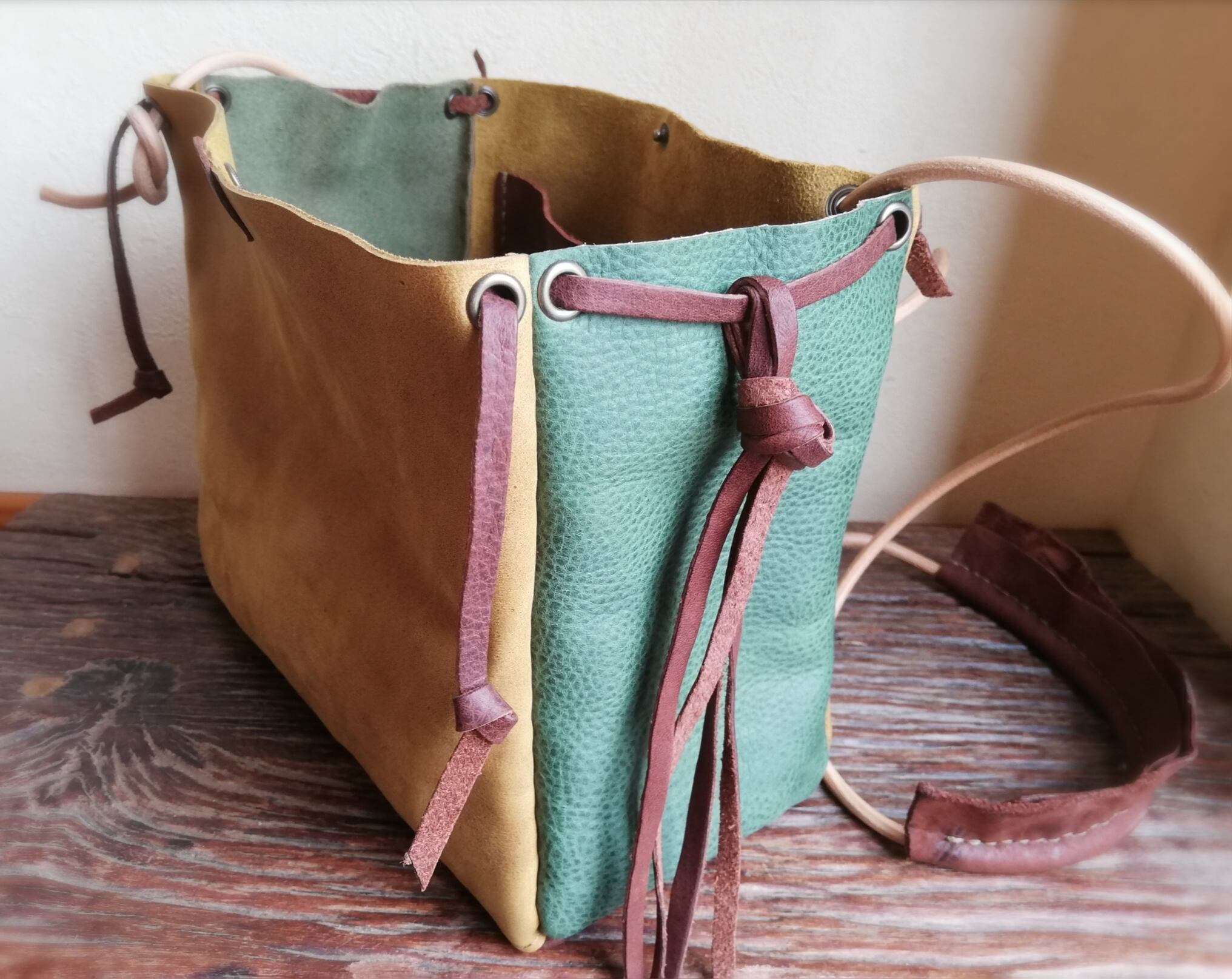 大人の虫かごショルダー オイルシュリンクレザー マスタードイエロー✗グリーン✗チョコ