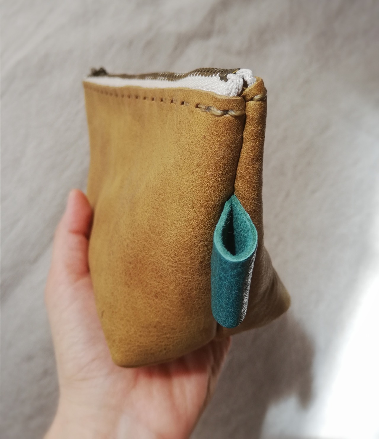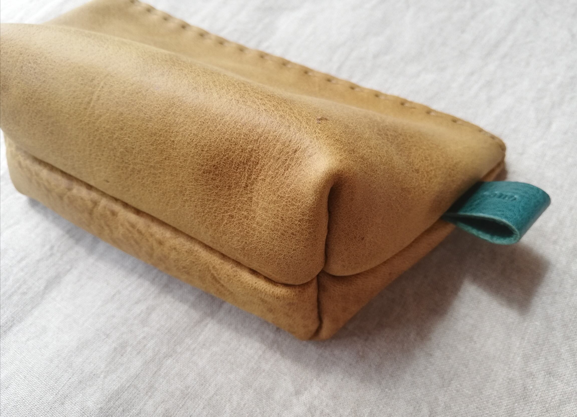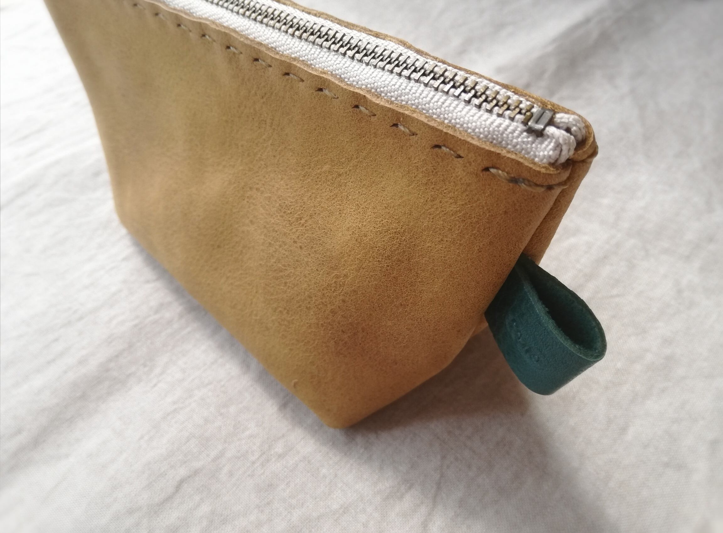 ちくちくステッチのポーチ 小物入れ マスタードイエロー オイルシュリンクレザー