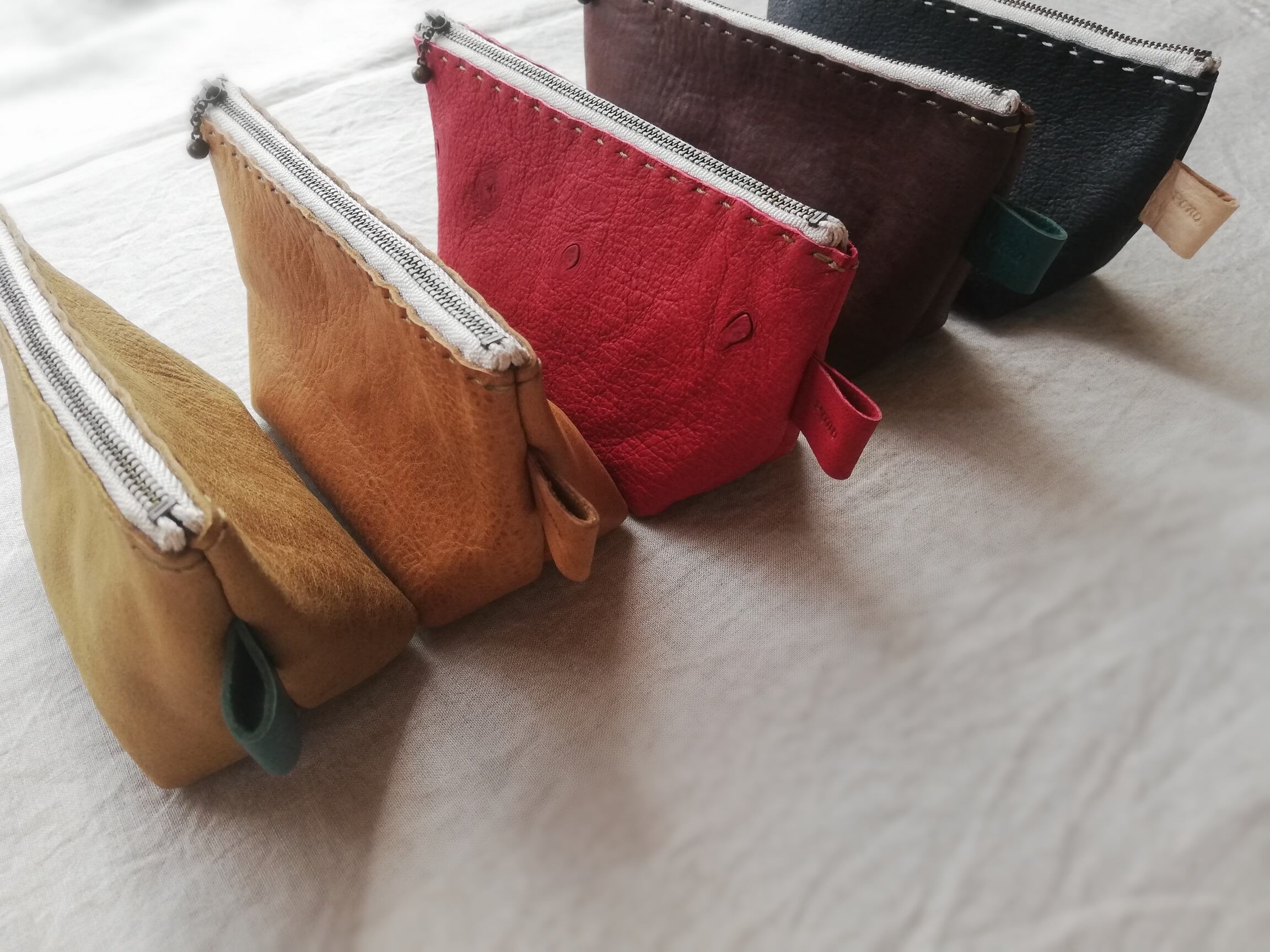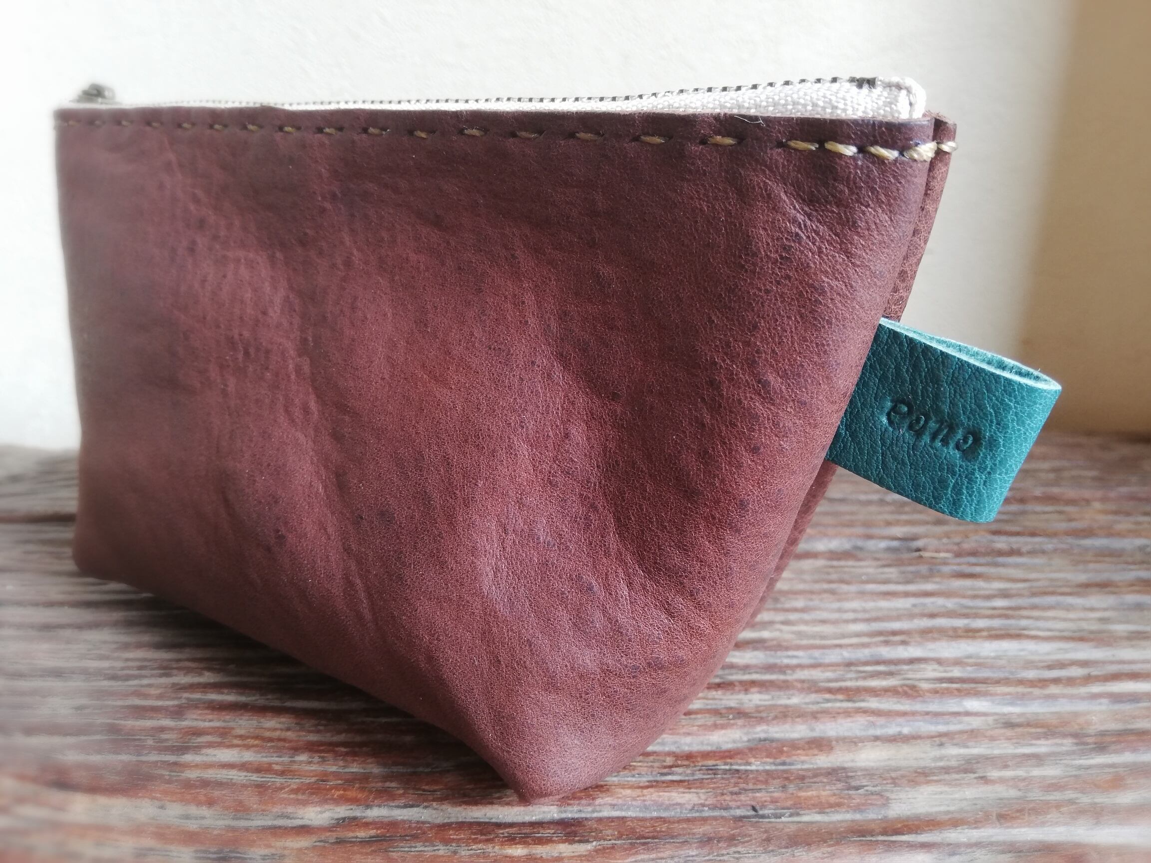 ちくちくステッチのポーチ 小物入れ チョコ オイルシュリンクレザー