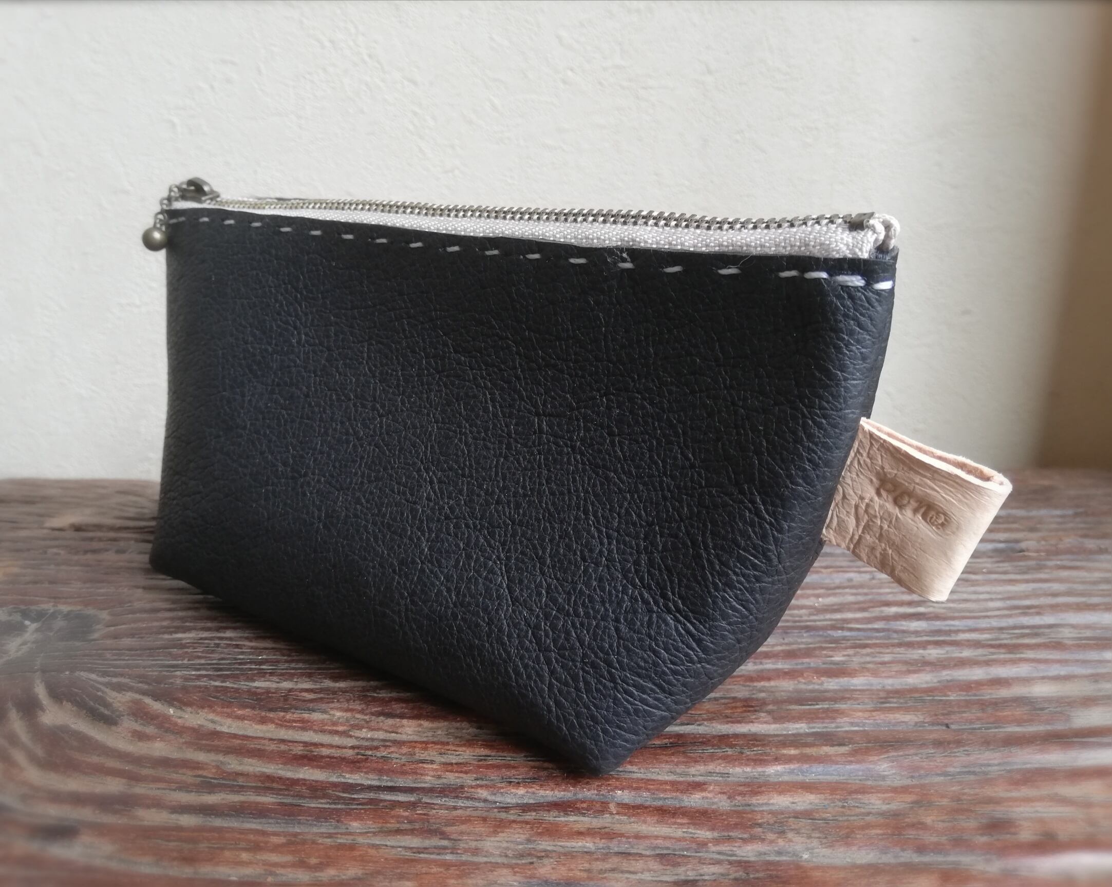 ちくちくステッチのポーチ 小物入れ ブラック ピッグスキン