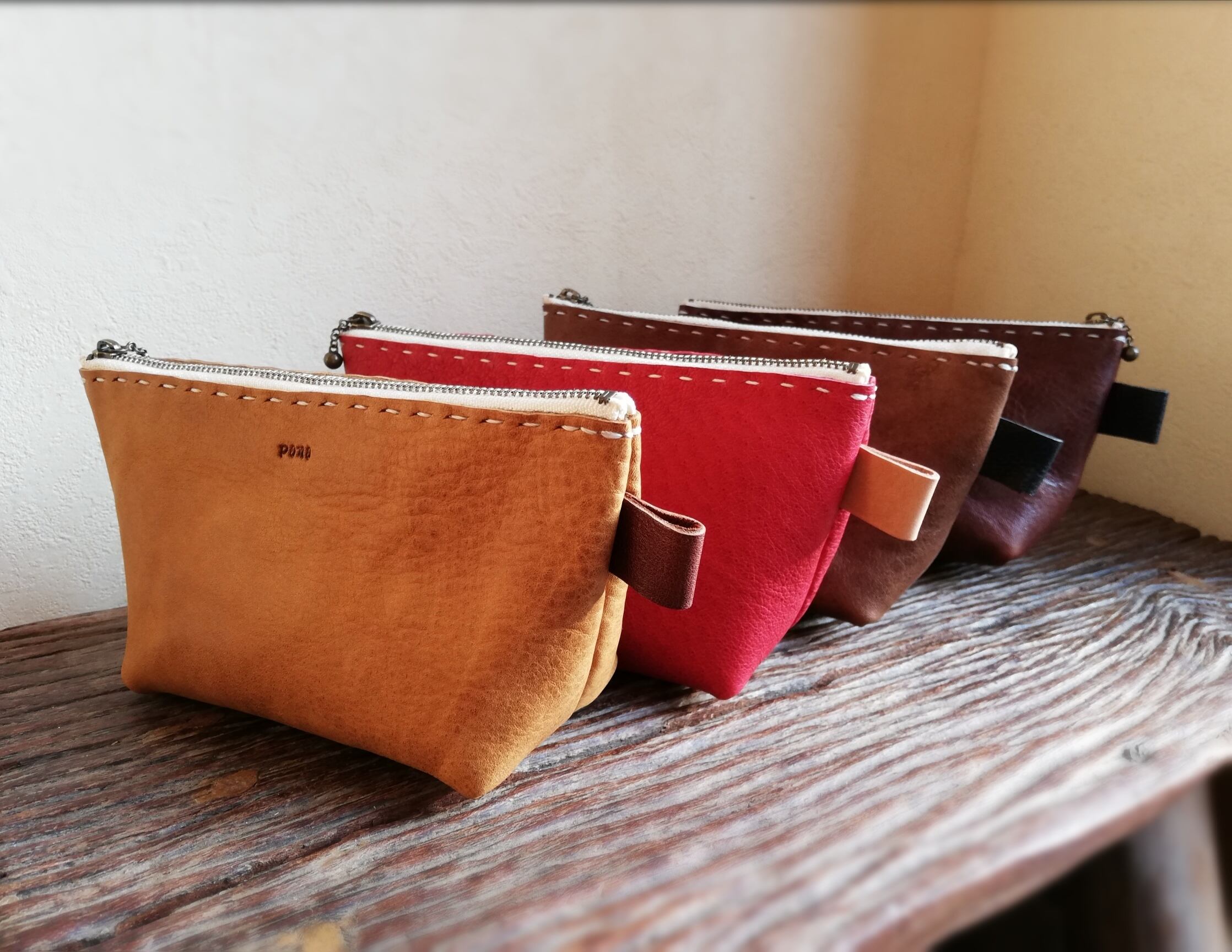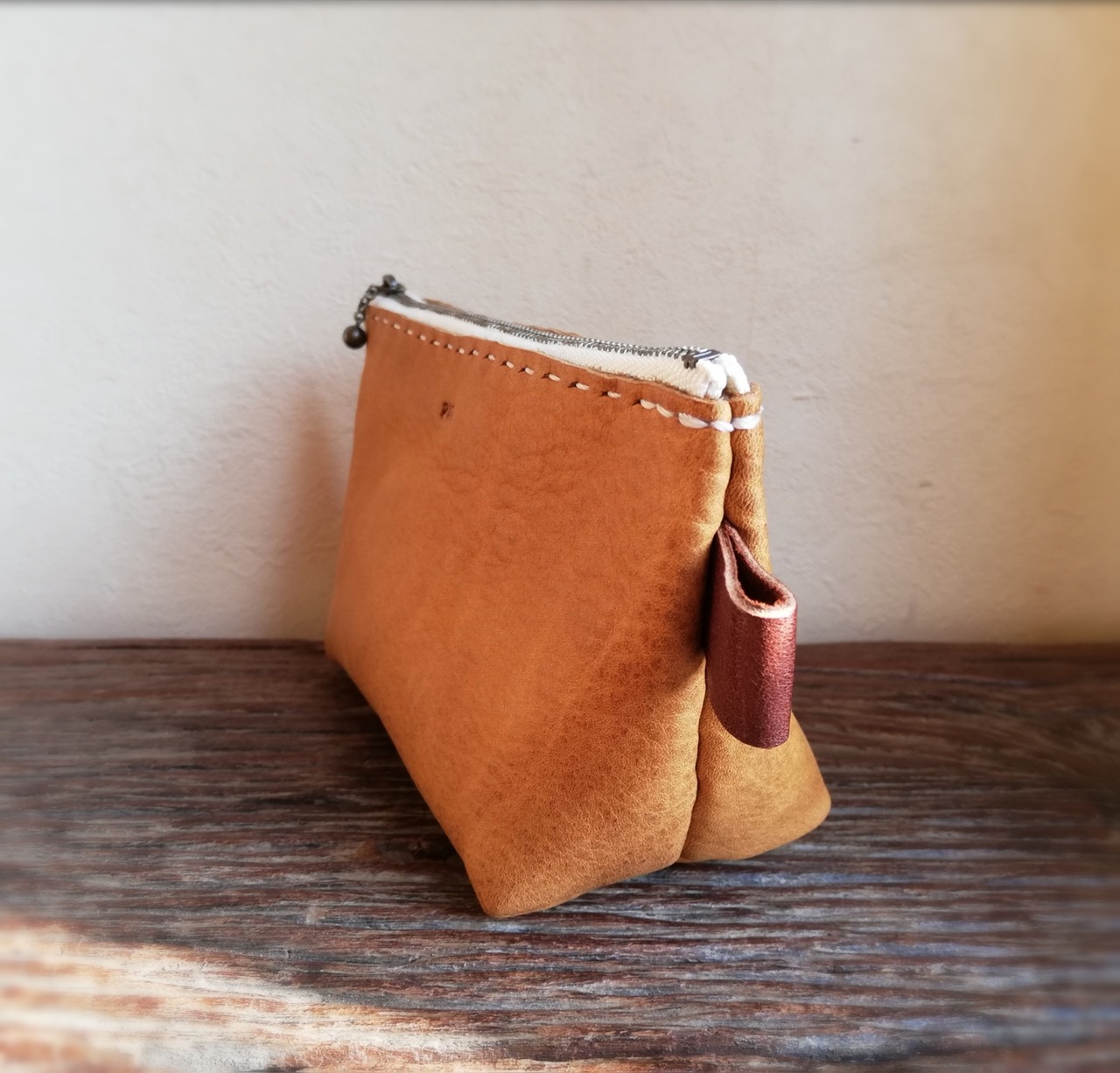 ちくちくステッチのポーチ ブラウン オイルシュリンクレザー