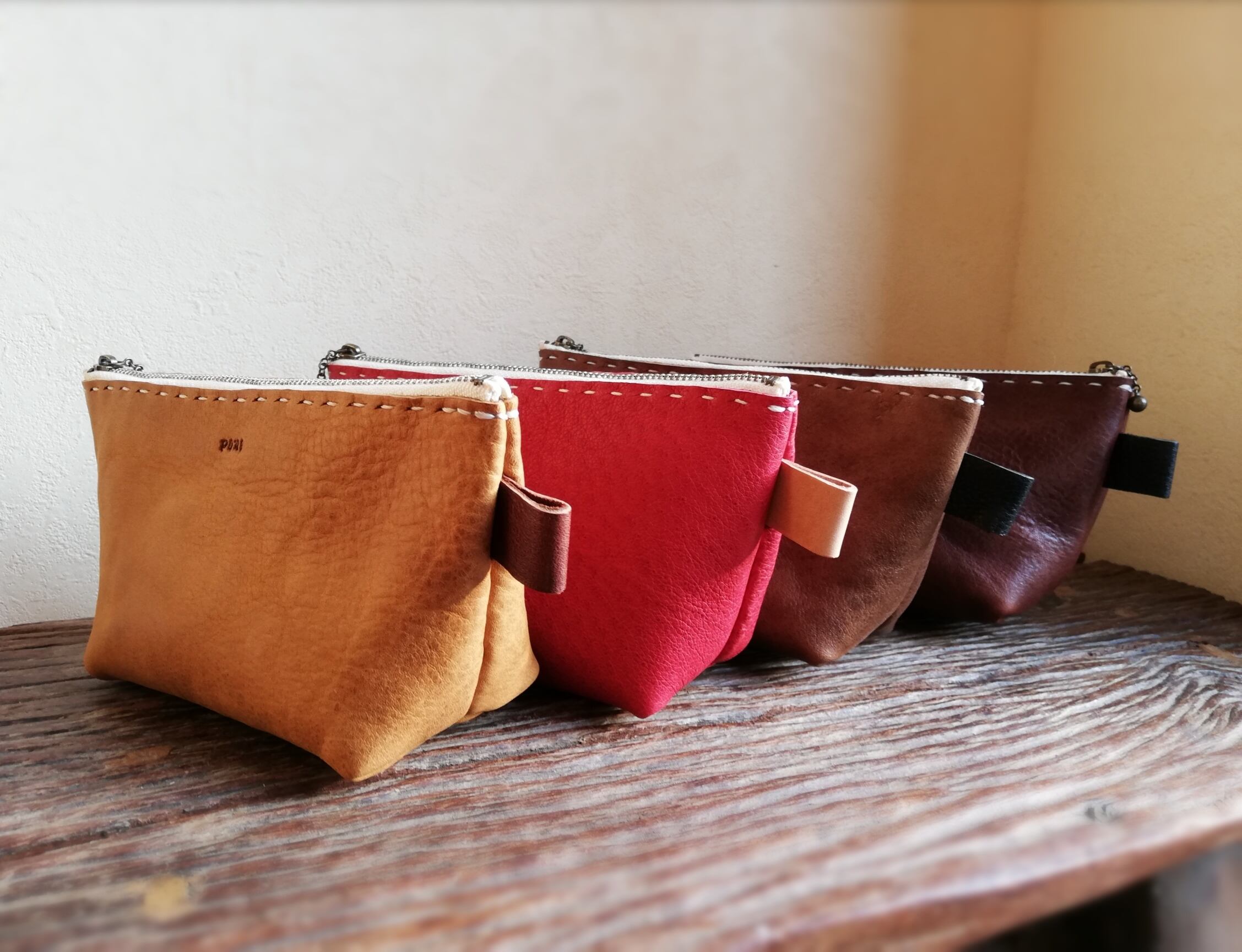 ちくちくステッチのポーチ ブラウン オイルシュリンクレザー