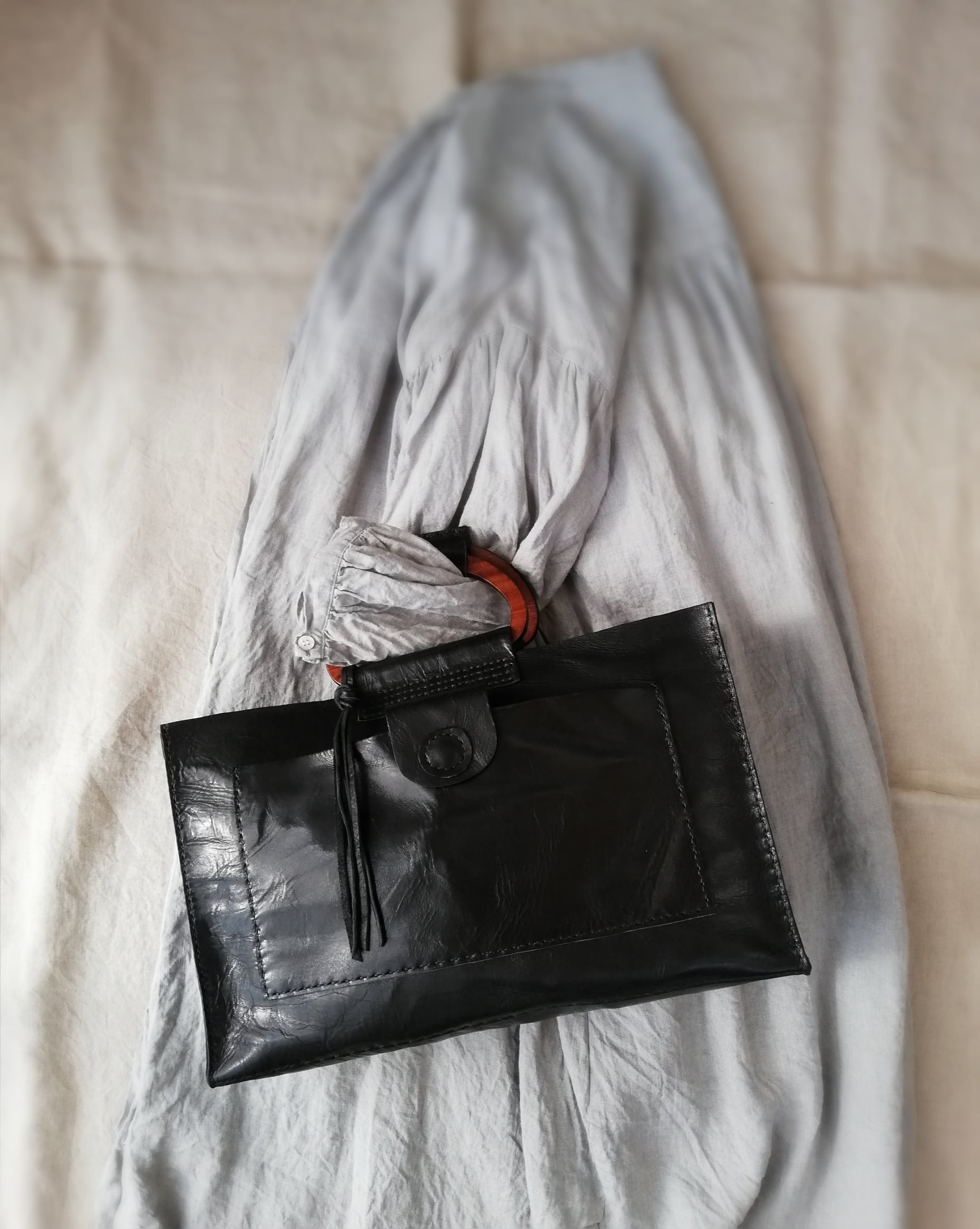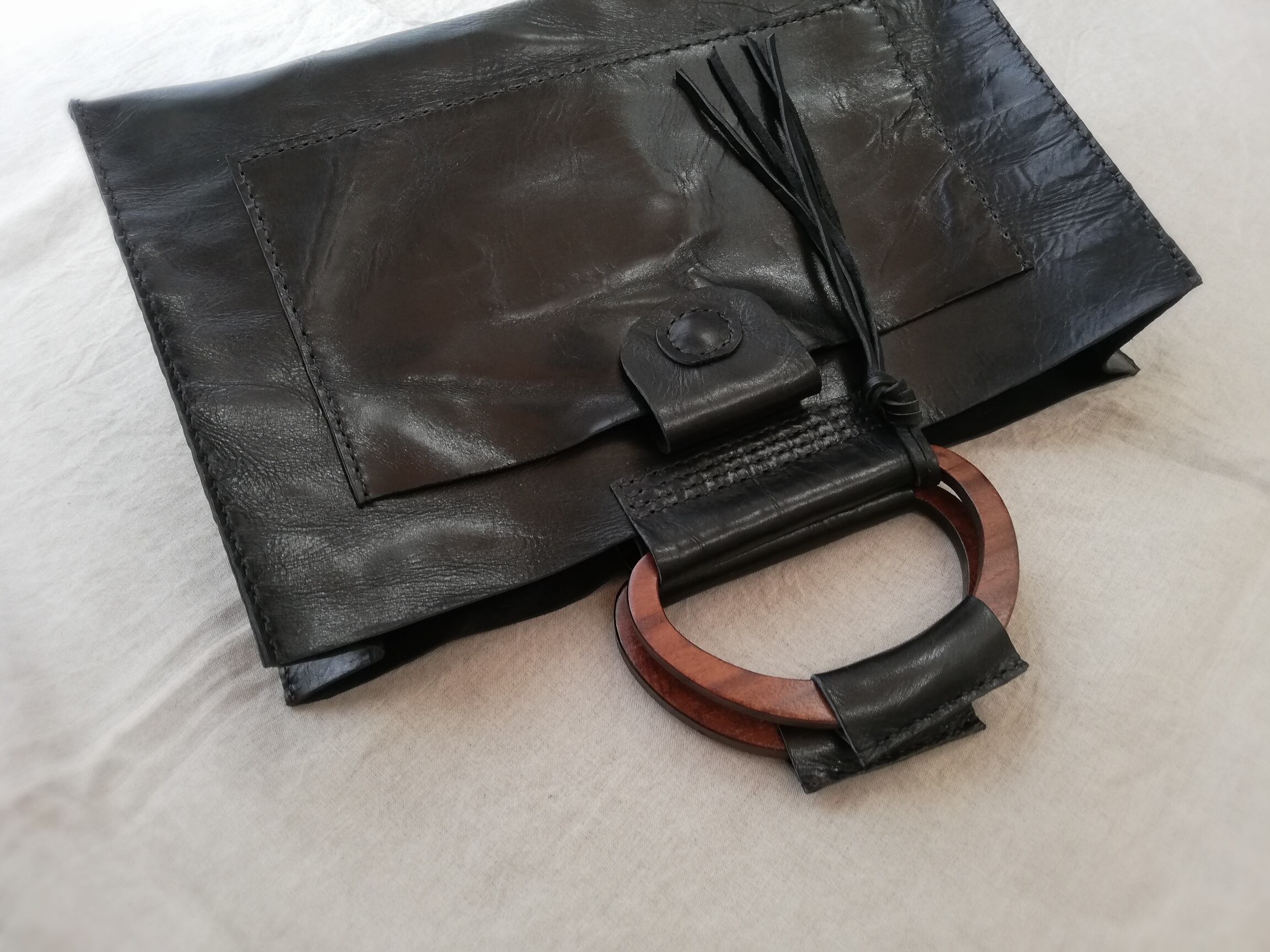 square tote M 横長 ブラック 木の持ち手 オイルワックスレザー