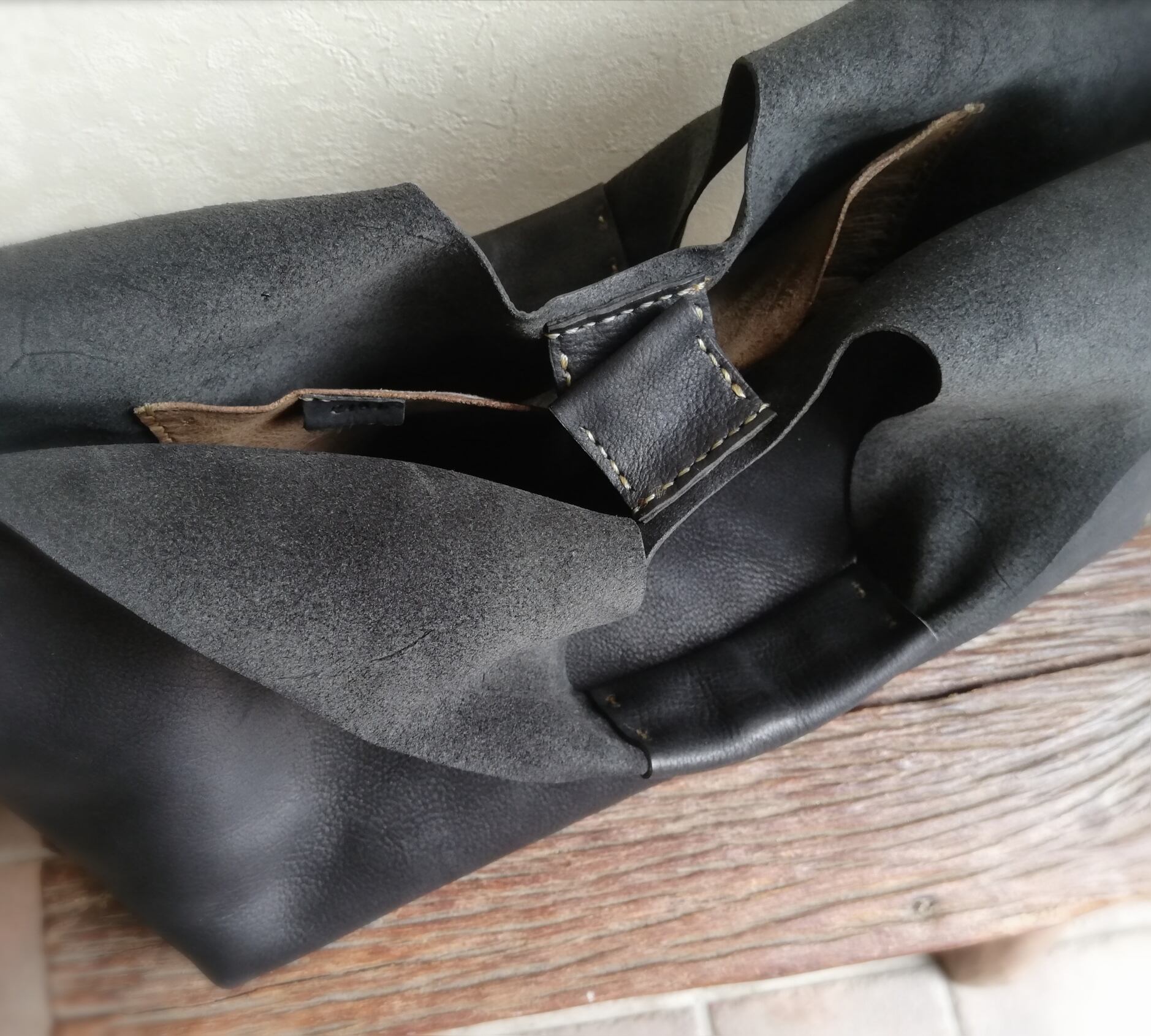 牛革。植物性タンニンで鞣されたオイルシュリンクレザーで、とても軽いのが特徴です