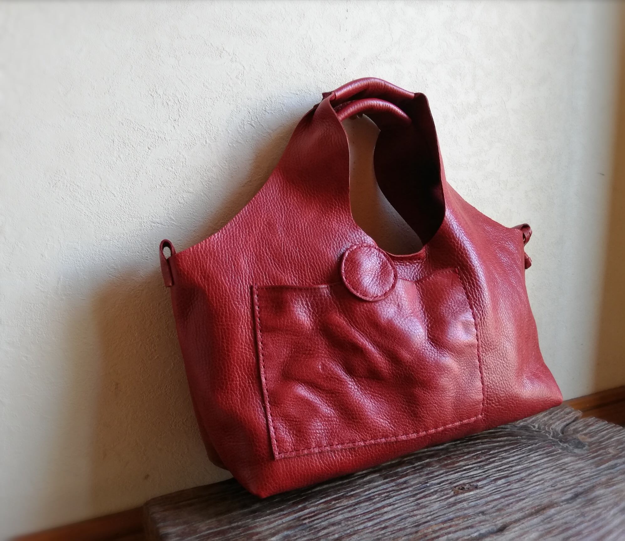 牛革。吟付きによる自然な光沢と染料仕上げによって透明感があり、シボが大きめであることでカジュアルさに加え、高級感がプラスされた素材です