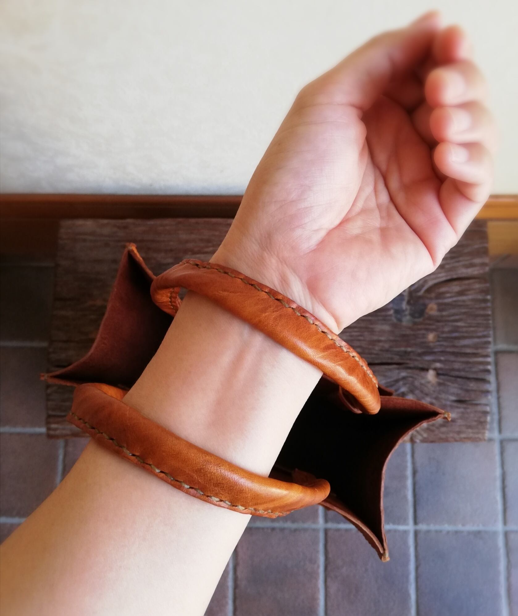 牛革。1枚1枚ほぼ手絞りによるランダムなヴィンテージ感のあるシワがあり、オイル効果により、伸縮性に富み、耐久性の高い素材です
