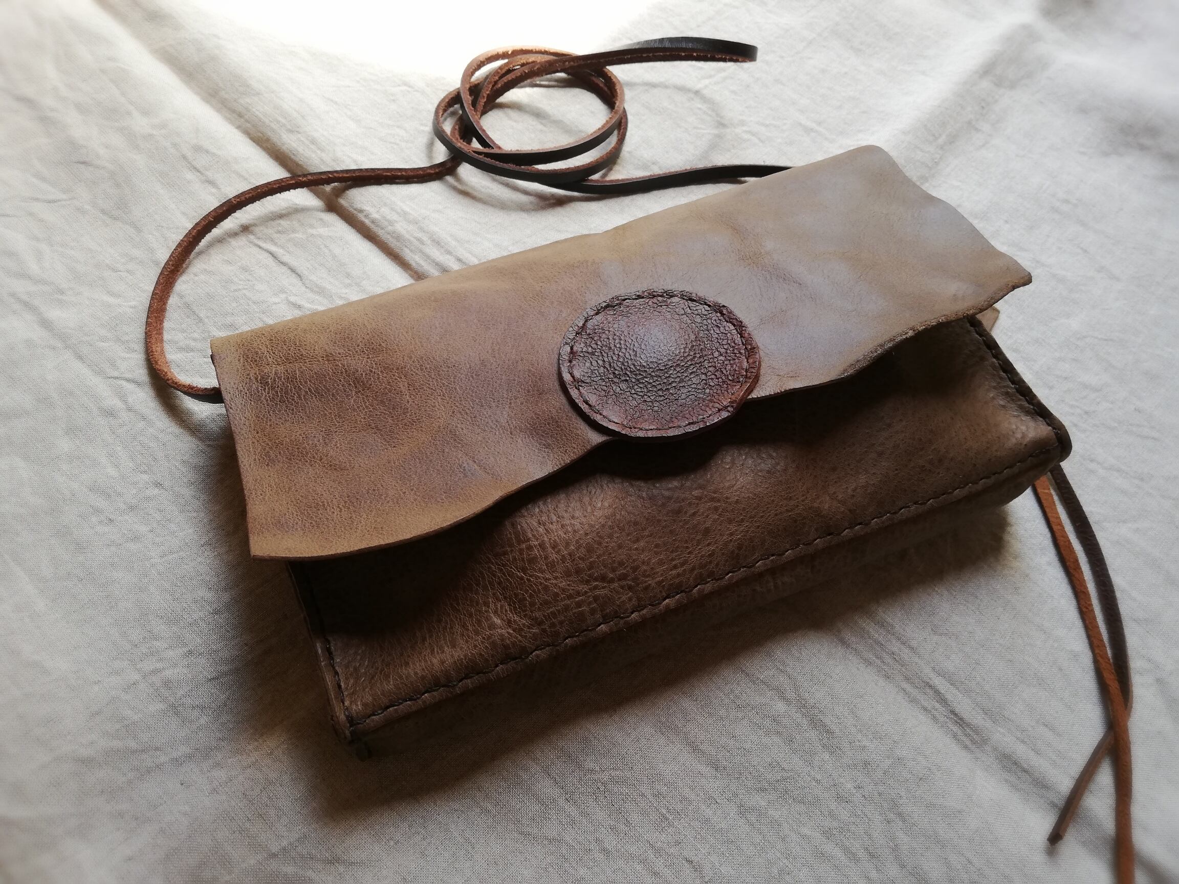 牛革。植物性タンニンで鞣されたオイルシュリンクレザーで、とても軽いのが特徴です