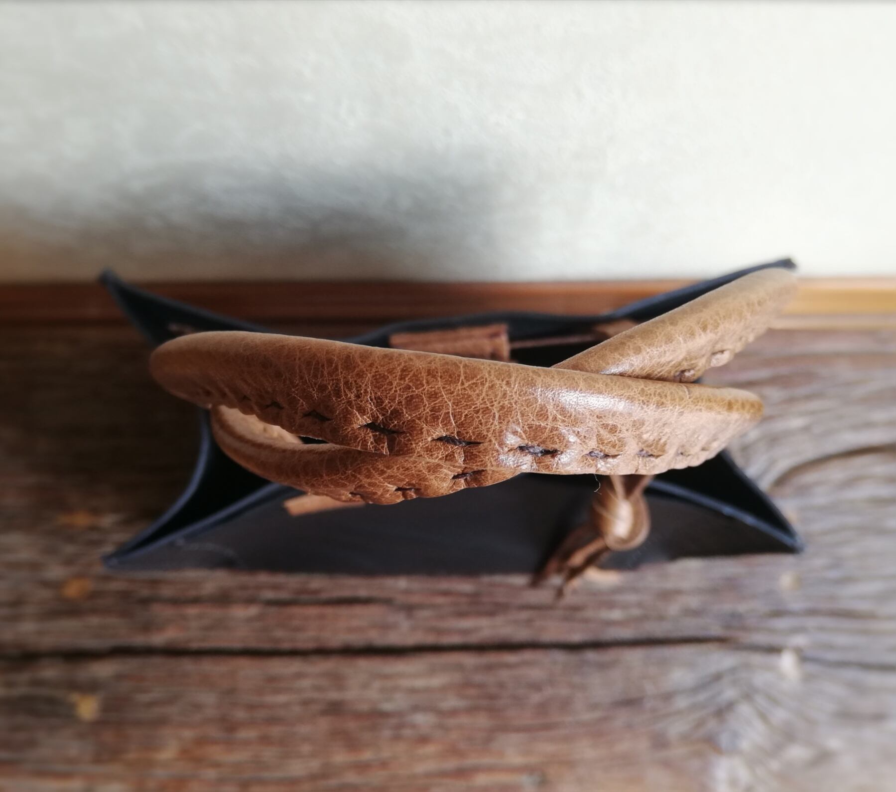 牛革。1枚1枚ほぼ手絞りによるランダムなヴィンテージ感のあるシワがあり、オイル効果により、伸縮性に富み、耐久性の高い素材です