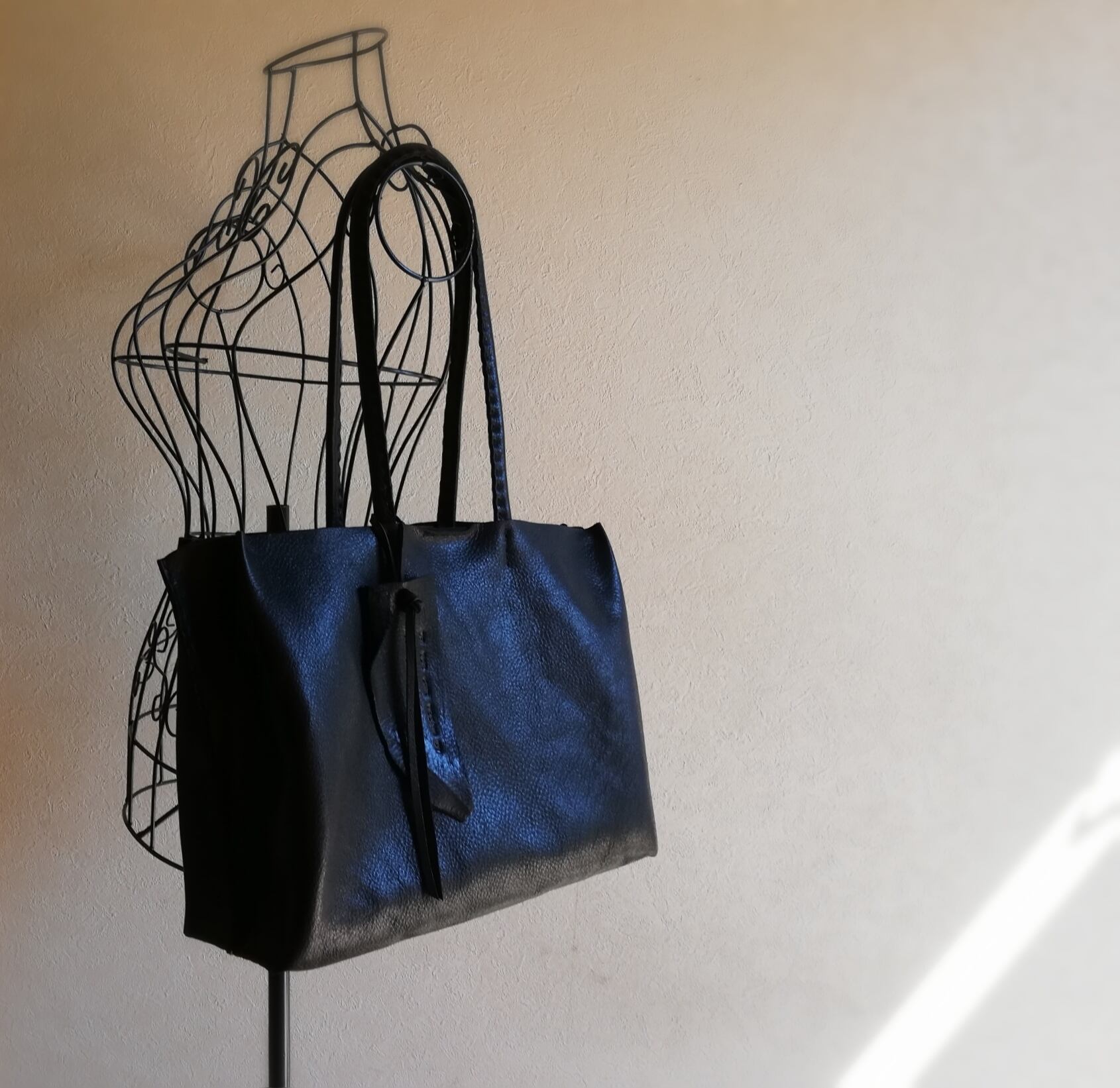 牛革。吟付きによる自然な光沢と染料仕上げによって透明感があり、シボが大きめであることでカジュアルさに加え、高級感がプラスされた素材です
