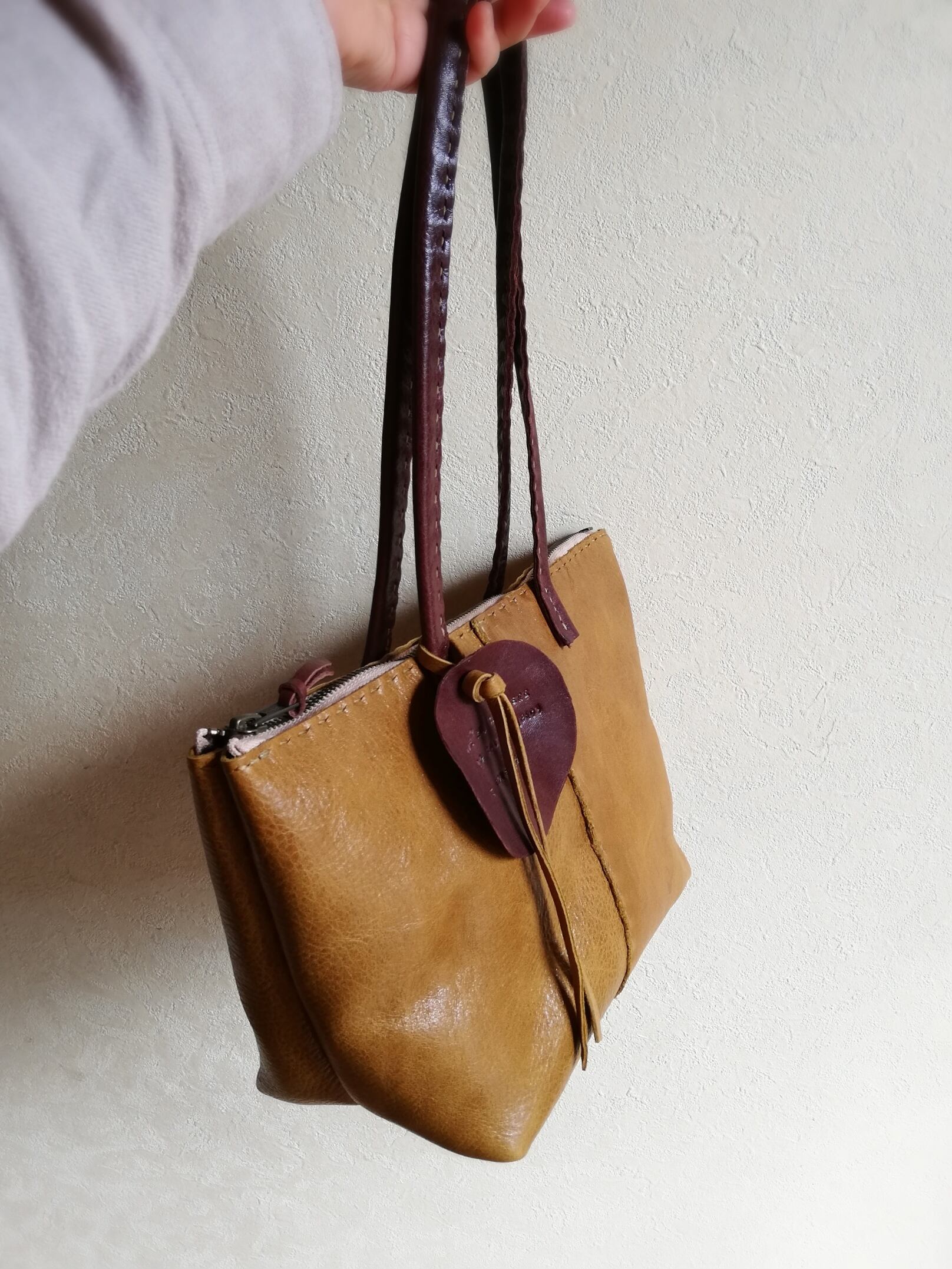 物の出し入れがスムーズになるよう少し横長サイズに、また、肩がけが容易にできるよう持ち手を長くしました