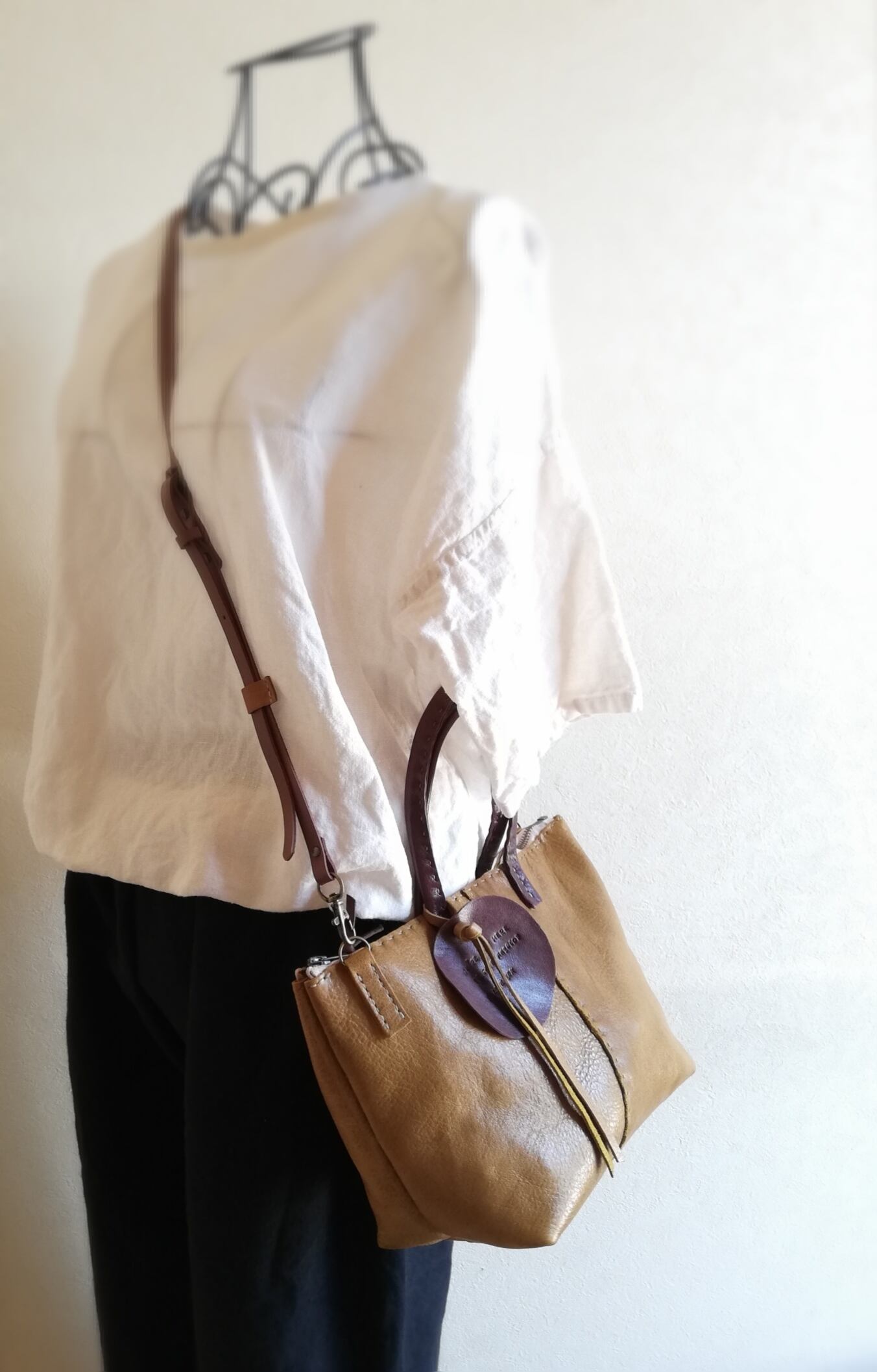 物の出し入れがスムーズになるよう少し横長サイズに、また、両手が自由になるようにショルダーもお付けしました(取り外し可能です)