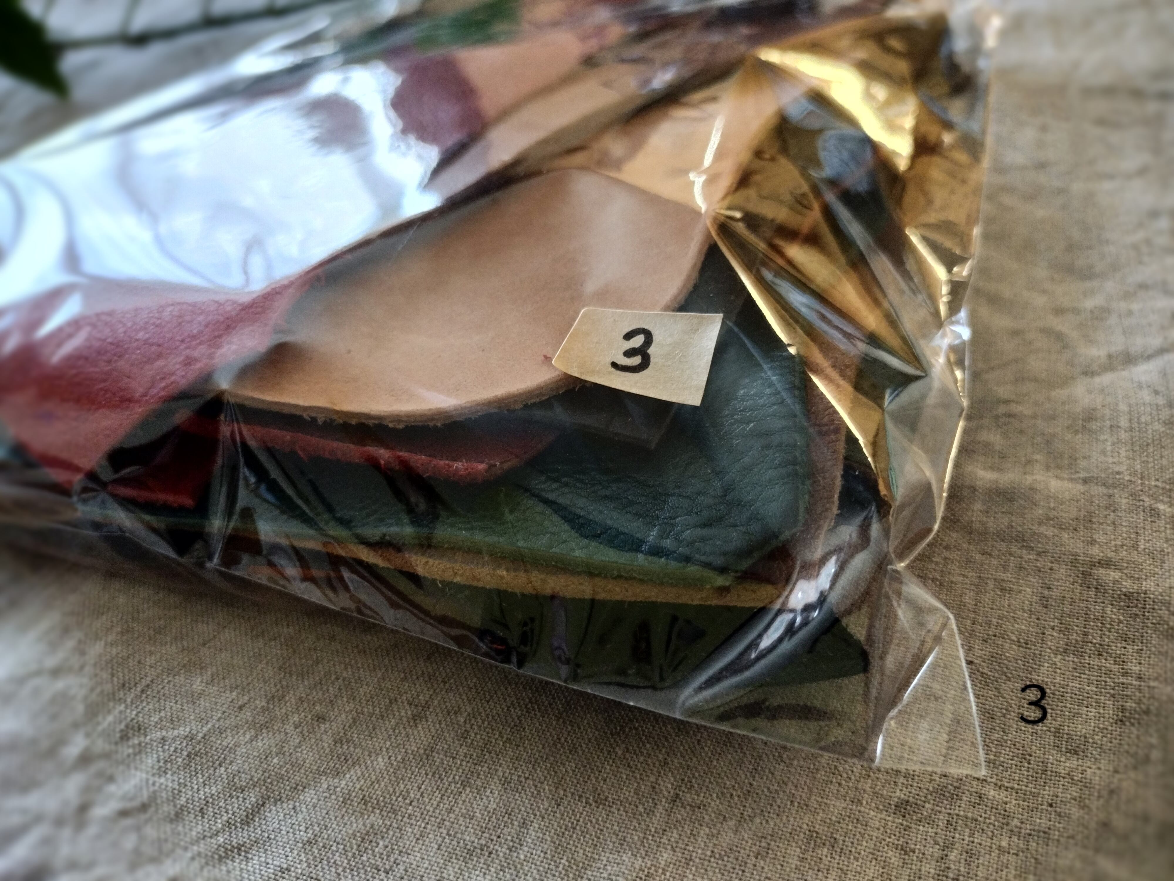 牛ヌメ革、ピッグスキンレザーのハギレをカラフルに詰めています